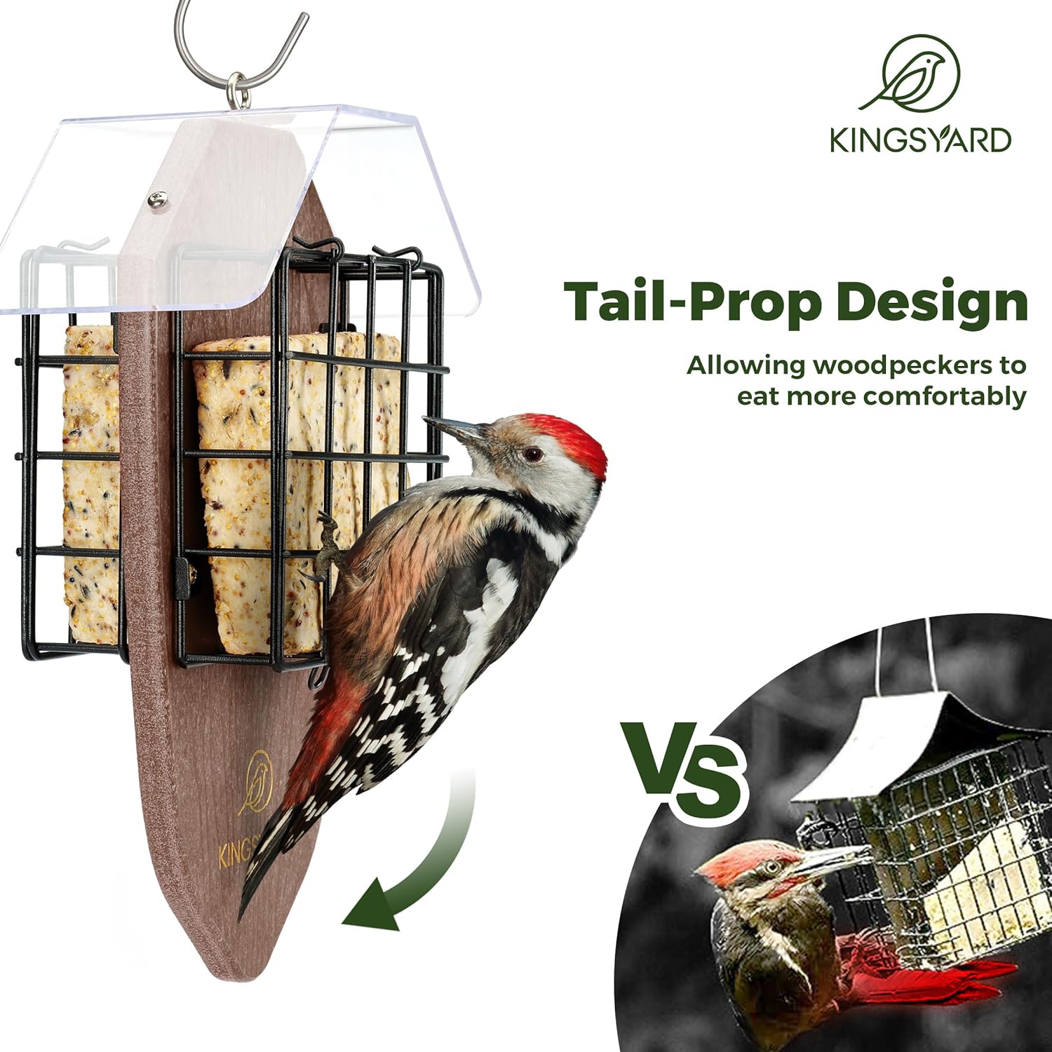 Tail-Prop Design: With an prolonged tail help space, this feeder permits clinging birds like woodpeckers to relaxation their tails and preserve stability whereas feeding, making certain that they take pleasure in suet in a pure and comfy posture
