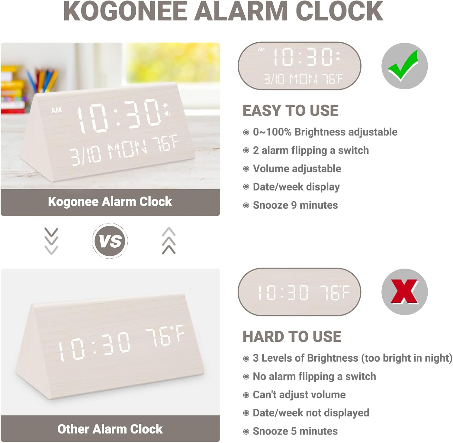 ⏰【5 Degree Brightness Adjustable alarm clock】- In contrast with the alarm clocks in the marketplace that solely have three ranges of brightness adjustment, this wood alarm clock is upgraded to 5-level dimming. Clients can modify the brightness to five percentile(0, 20%, 40%, 60%, 80%, 100%), which solves the issue of too brilliant show at evening and helps you go to sleep higher.