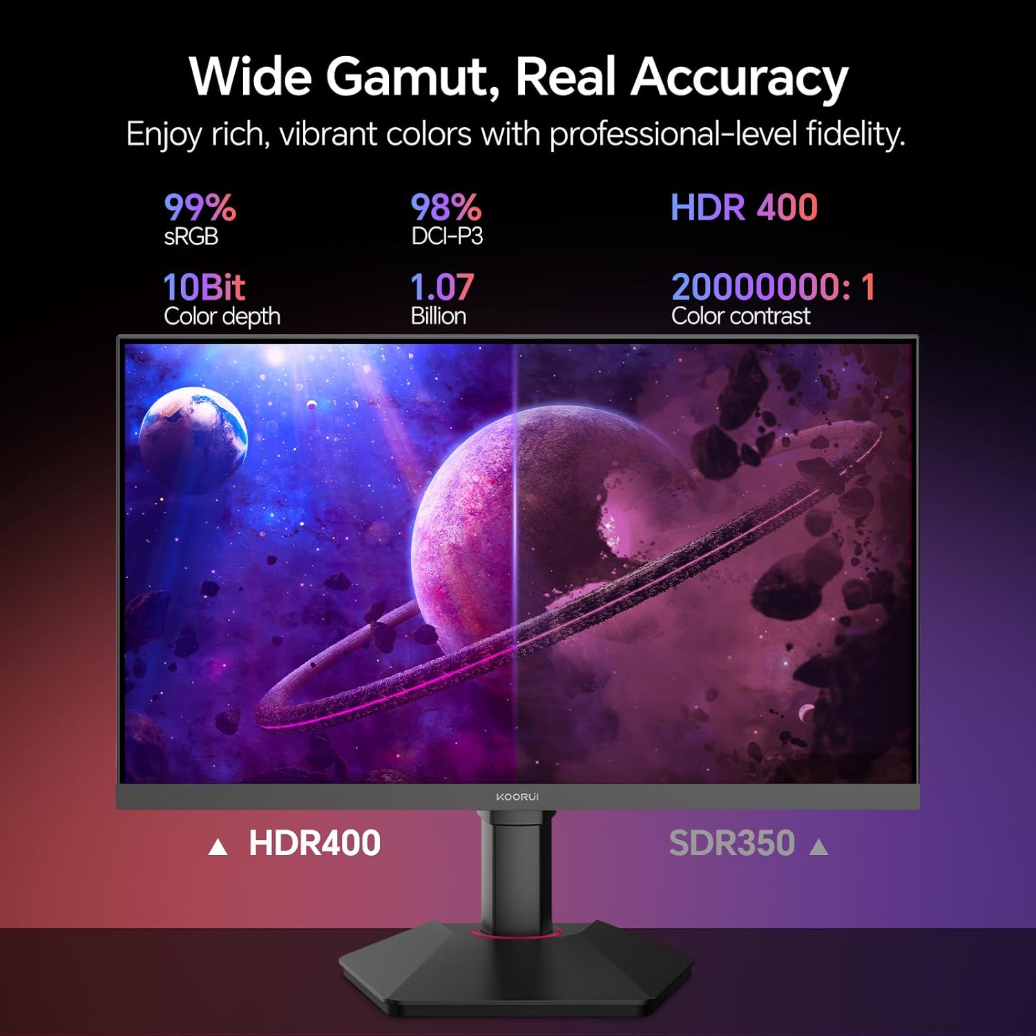 98% DCI-P3 & HDR400: The KOORUI 27 inch gaming monitor covers 98% DCI-P3 for cinema-quality colour and helps HDR400 for deeper blacks and extra dynamic vary. Whether or not you are gaming, enhancing, or streaming, your content material will look extra vivid and lifelike than ever.