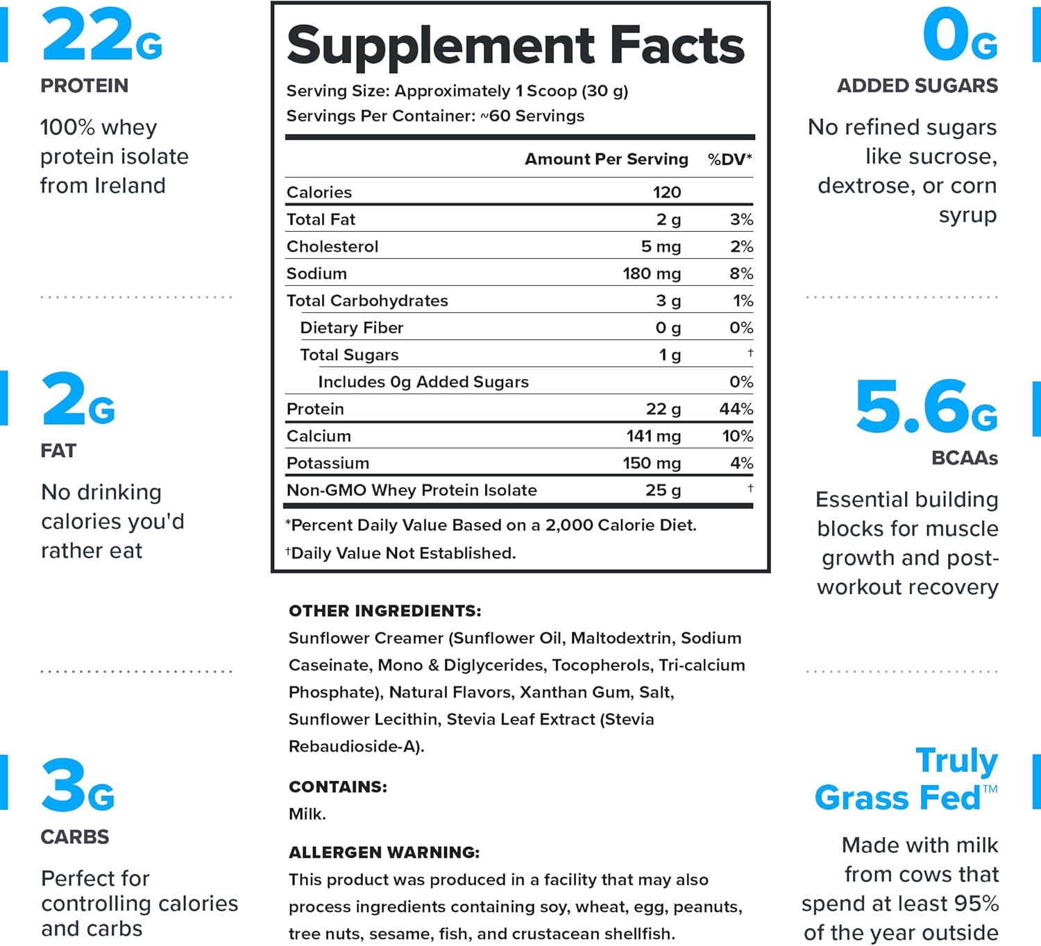 22 grams of grass-fed protein per serving with 12 grams of important amino acids, 5.5 grams of BCAAs, and no lactose or added sugars.