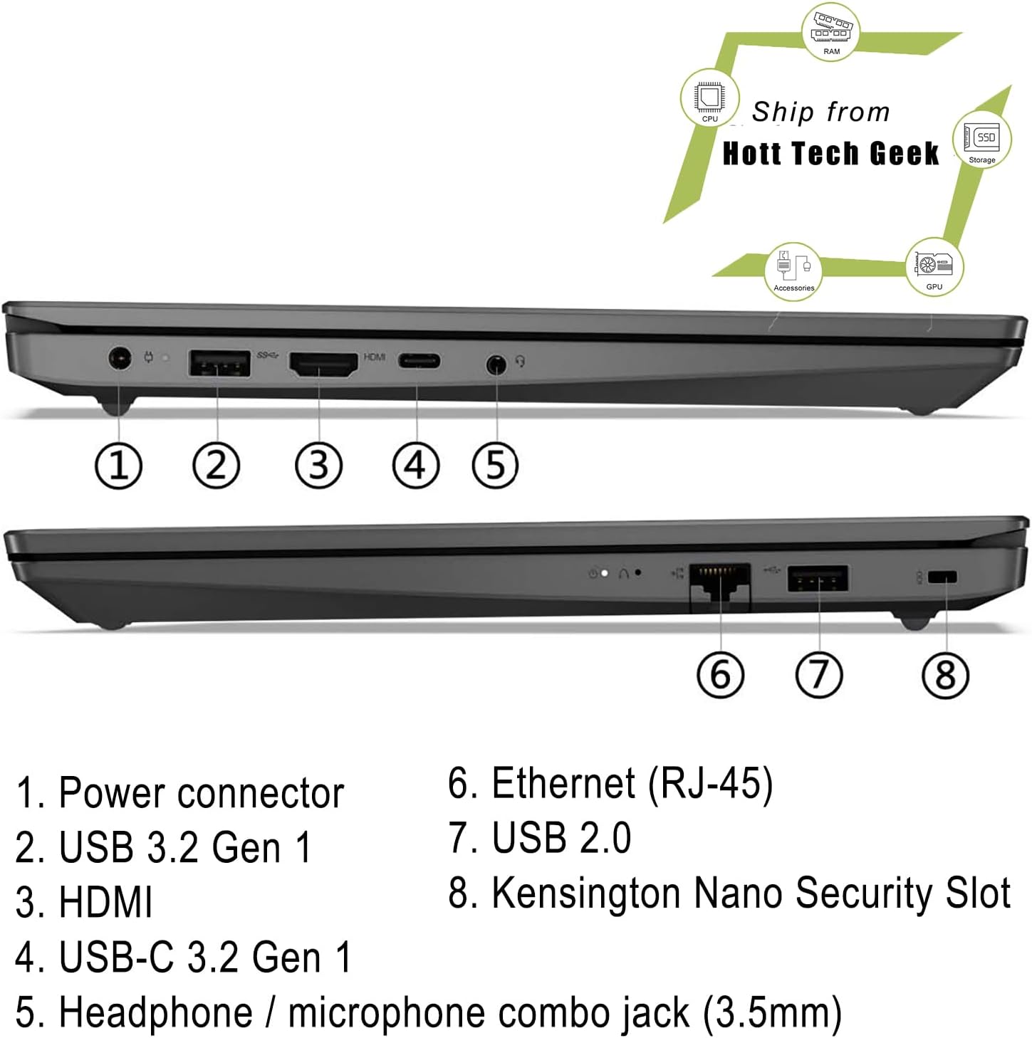 2.USB 3.2 Gen 13.HDMI 1.4b4.USB-C 3.2 Gen 1 (help information switch and Energy Supply 3.0)5.Headphone / microphone combo jack (3.5mm)6.Ethernet (RJ-45)7.USB 2.08.Kensington Nano Safety Slot