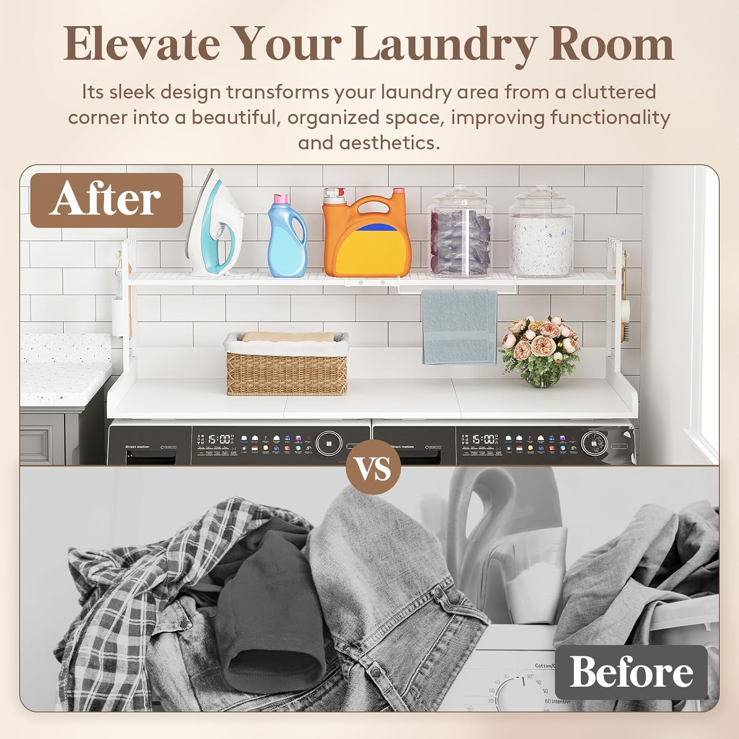 This versatile floor provides a really perfect workspace for sorting, ironing, and folding garments, whereas additionally offering ample room for organizing laundry detergents and provides. With a sturdy capability of as much as 200 kilos, this work space is designed for each day use, guaranteeing it might deal with the calls for of your busiest laundry days whereas retaining all the pieces effectively inside attain. Whether or not you are getting ready a load or placing away clear objects, it enhances the performance of your laundry area.