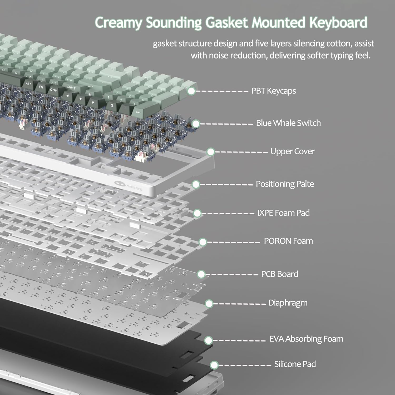 [CREAMY THOCK SOUND GASKET STRUCTURE]: LIGHT100 keyboard mounting is completely different from the standard screw fixing technique, however utilizing gaskets mounted on the highest and backside sides between the panel and the keyboard shell, which acts as a cushioning layer, as well as, the keyboard is designed with 5 layers sound-absorbing foams filling, can successfully reduces the noise, improves the typing consolation and accuracy, and brings crisp, clear and softer typing really feel.