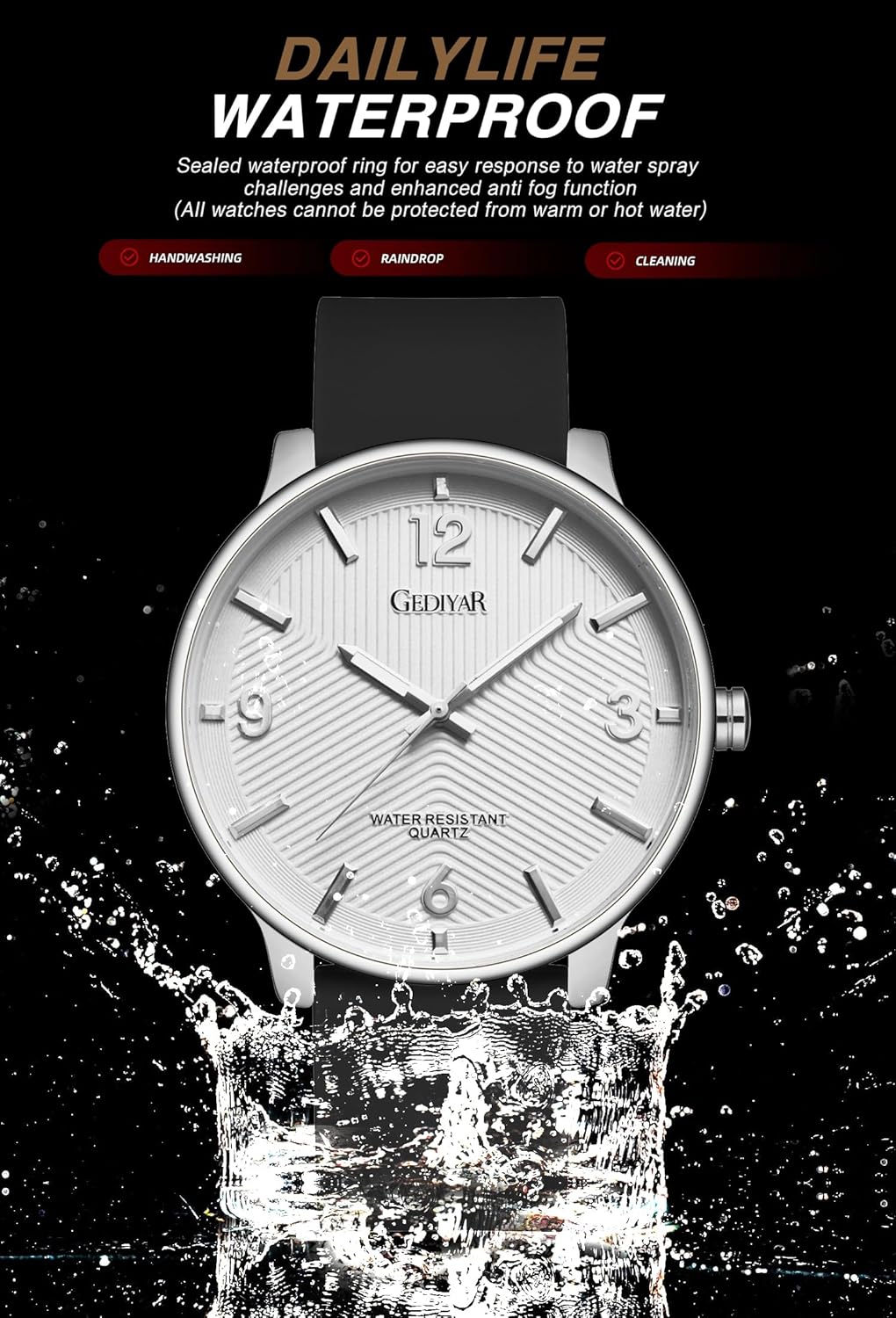 This watch is designed to face up to water splashes and transient immersion, guaranteeing its longevity and reliability.