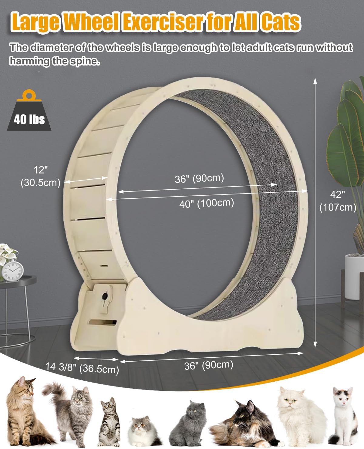✅【 Massive Wheel Exerciser For All Cats 】 Total Dimensions (L x W x H): 40″ x 14 3/8″ x 42″ ( 100cm x 36.5cm x 107cm). Cat Operating Wheel Diameter: 40″ (100cm), Width: 12″ (30.5cm). The diameter of the wheels is giant sufficient to let grownup cats run with out harming the backbone.