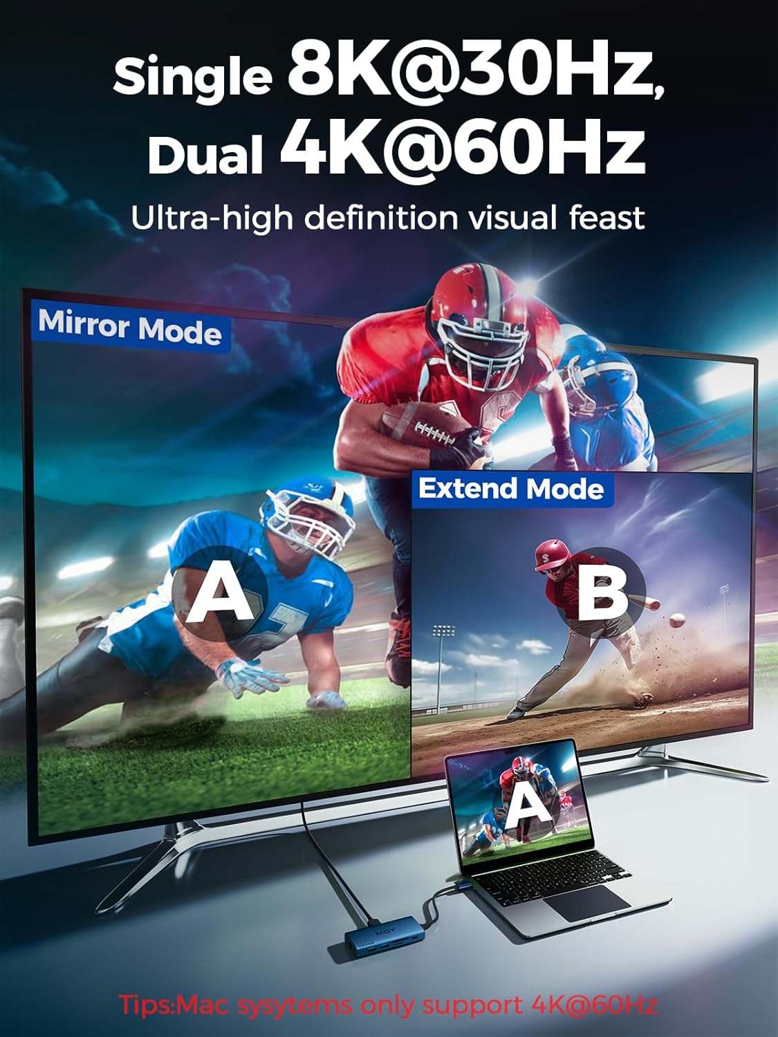 【Twin Show Extremely HD Output】The docking station twin hdmi helps single 8K, twin 4K@60Hz mirror/prolong modes. Best USB C to HDMI adapter for MacBook/Home windows laptops. Extremely clear pictures deliver you a visible feast!(Observe:1、HDMI1 8K requires DP1.4 protocol PC assist (Mac programs solely assist 4K ). 2、For MAC, the show on each exterior screens might be equivalent.)