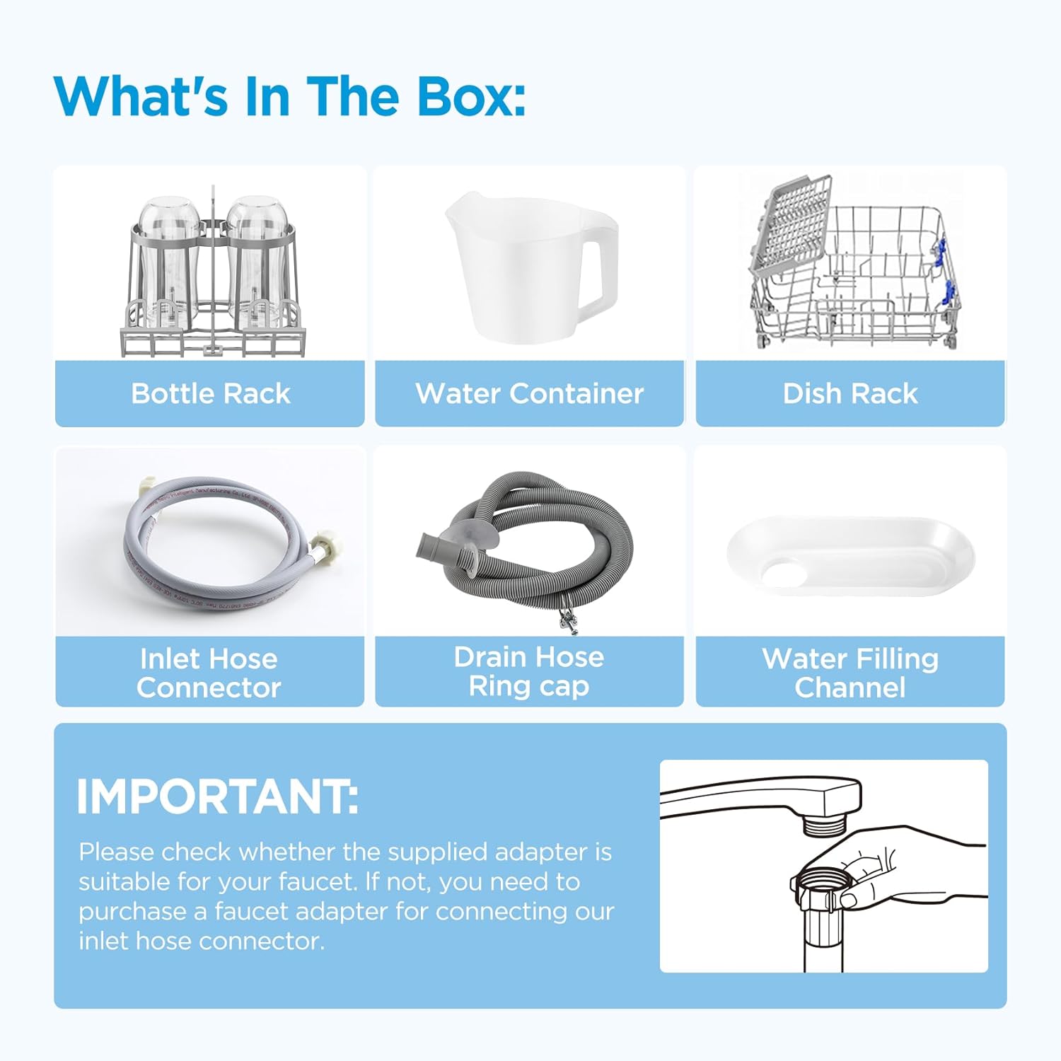NO INSTALLATION NEEDED — Including water manually within the 1.32 gallons built-in water tank, you may put the dishwasher in any appropriate place with out connecting to faucet water. Or it may be hooked to the kitchen faucet straight with the included water hose (Adapter included).