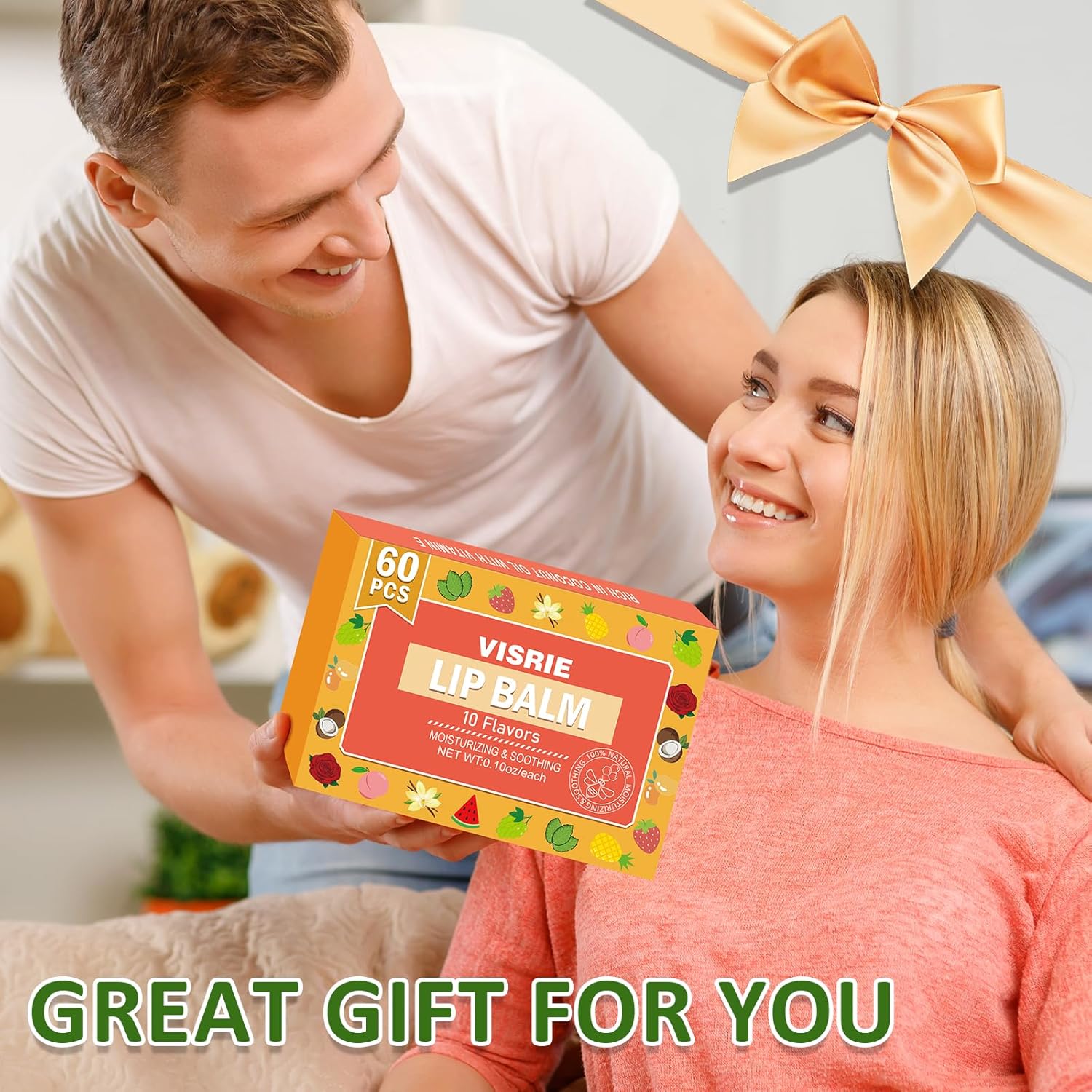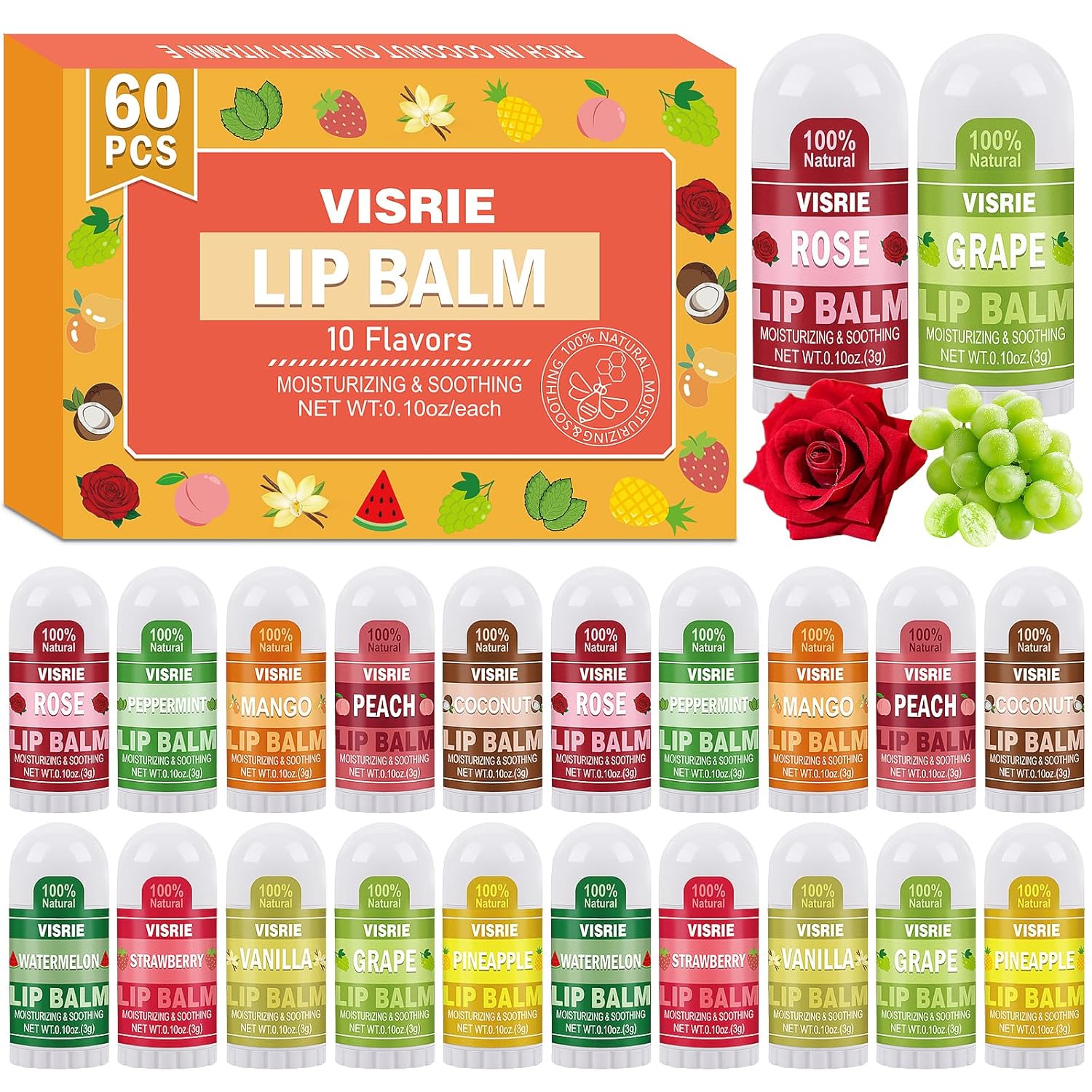 Assorted Lip Balm Bulk: This set is available in 60 rely mini lip balm sticks in 10 standard flavors: Apple, Watermelon, Mango, Coconut, Peppermint, Pineapple, Rose, Grape, Peach, and Vanilla