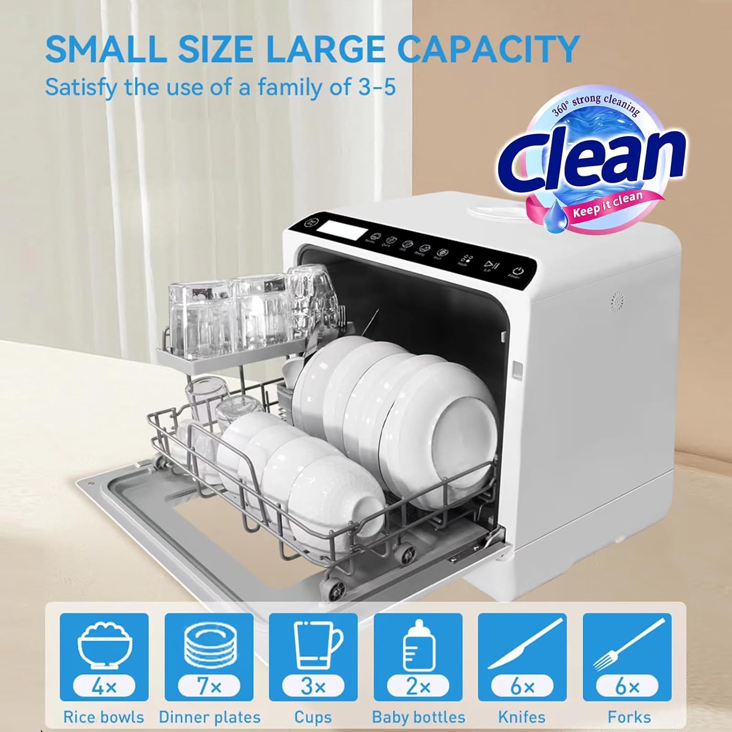 【Three-in-one perform】With scorching air drying mode, moveable countertop dishwasher is supplied with the capabilities of dishwasher, dryer and cupboard to maintain your tableware dry and odor-free.