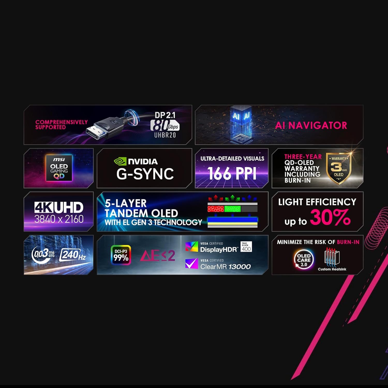 Expertise immersive gaming with the MPG 272URX QD-OLED gaming monitor. It encompasses a 3840×2160 (UHD) QD-OLED panel, 240Hz refresh charge, and speedy 0.03ms(GtG) response time. VESA certification for ClearMR 13000 and DisplayHDR True Black 400 ensures exceptionally vivid photos and mitigates movement blur. OLED Care 2.0 expertise helps stop burn-in. For console avid gamers, the MPG 272URX QD-OLED offers HDMI 2.1 ports with 48Gbps bandwidth, 4K 120Hz assist, VRR, and ALLM and the newest DisplayPort 2.1a presents 80Gbps bandwidth for gaming {and professional} shows. Its superior cable helps future {hardware} with no loss in efficiency.