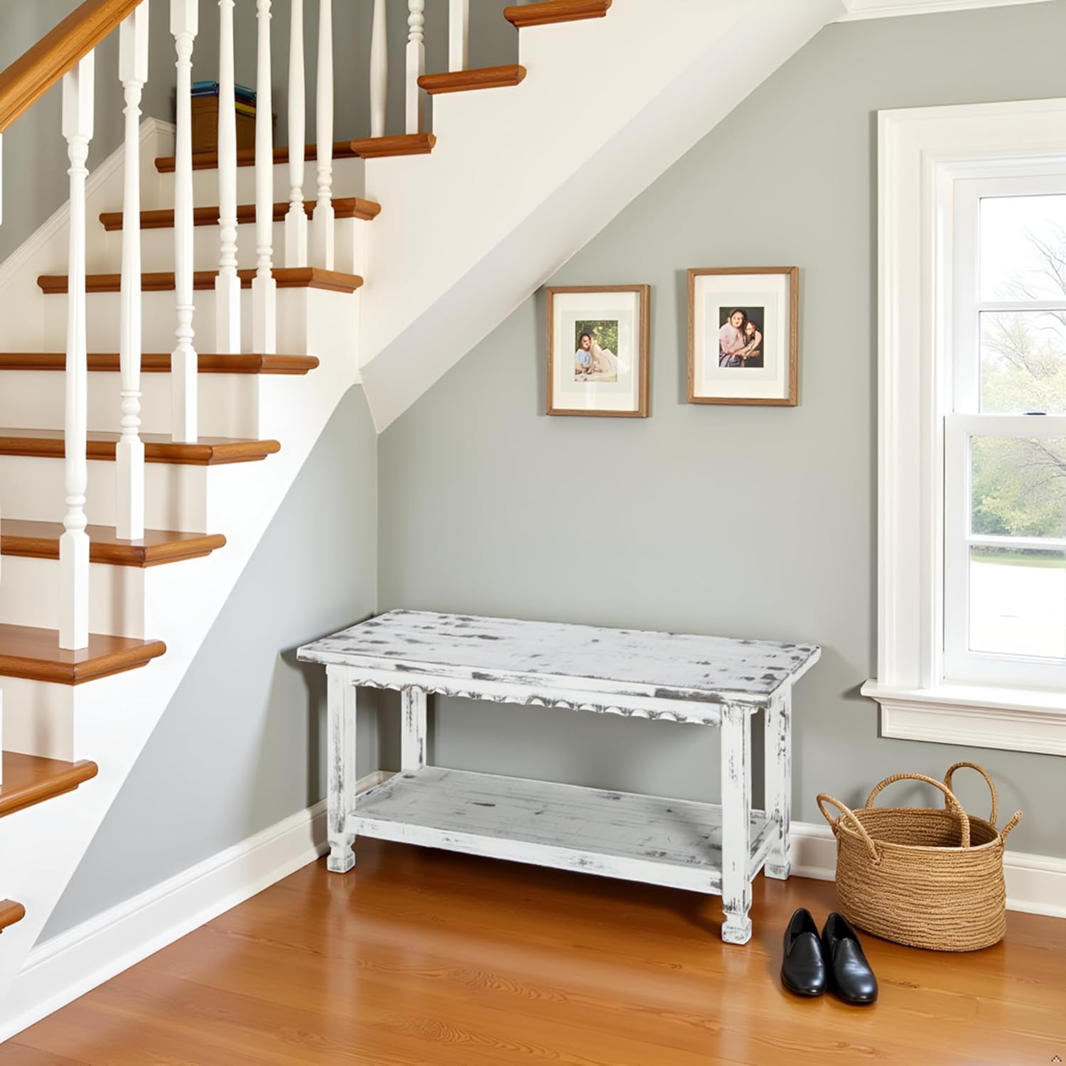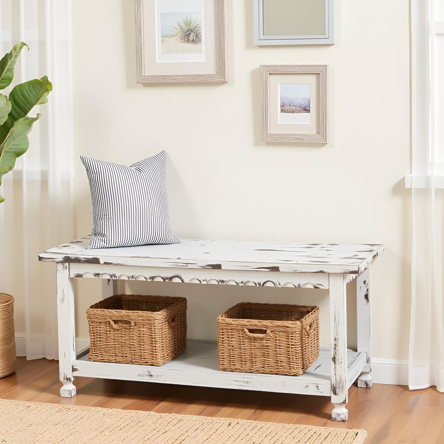 36-INCH FARMHOUSE BENCH – This rustic wooden bench encompasses a decrease shelf for storing sneakers, baskets, or baggage—superb for organizing entryways, mudrooms, or bedrooms. Completed in distressed white with traditional dental molding and turned legs for genuine cottage attraction.