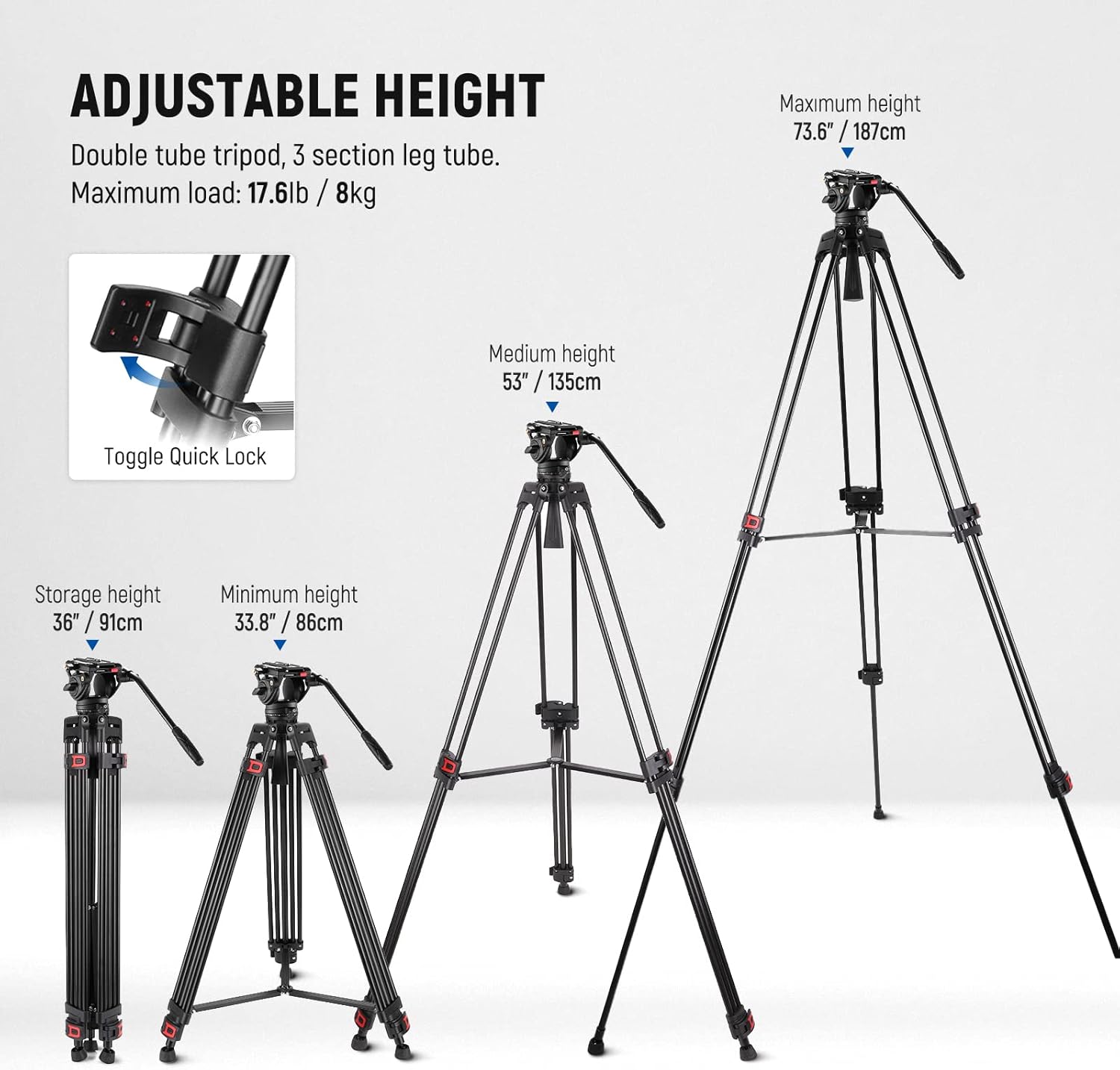 【Versatile Heavy Obligation Video Tripod】 TP74 tripod stabilizes a digicam or camcorder to take pictures and movies of sports activities, weddings, landscapes, and merchandise. Double tandem aluminum alloy legs present dependable stability with a max load capability of 17.6lb/8kg. The mid degree spreader and nonslip rubber toes for additional stability