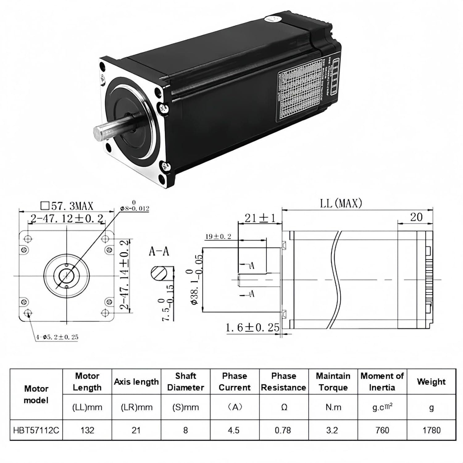 SPECIFICATIONS: Kind: Hybrid; Encoder line quantity: 1000; Motor size: 57x57x132mm / 2.24*2.24*5.2 inch; Shaft Diameter:8mm; Lead wire: 4; Assist DC Energy Provide:DC20-48V; Present: 3.5A.