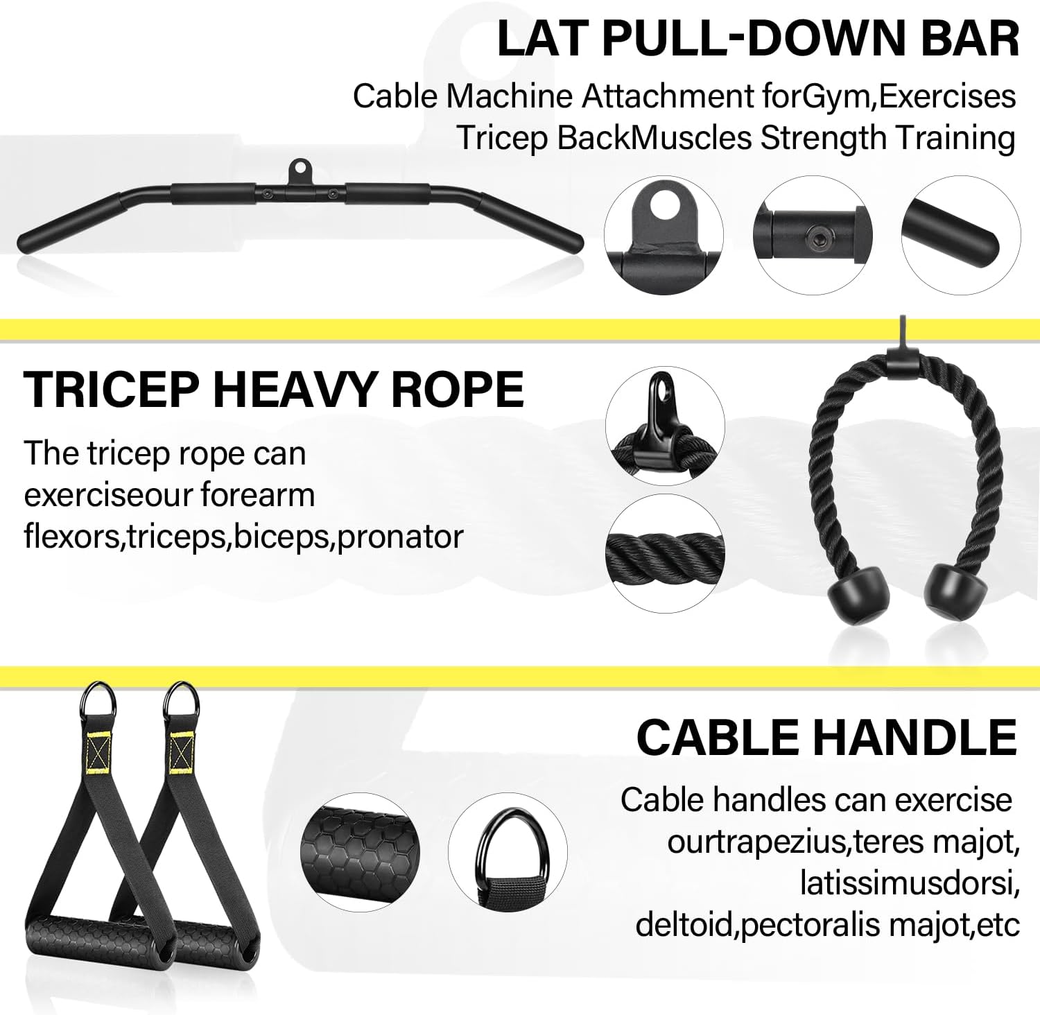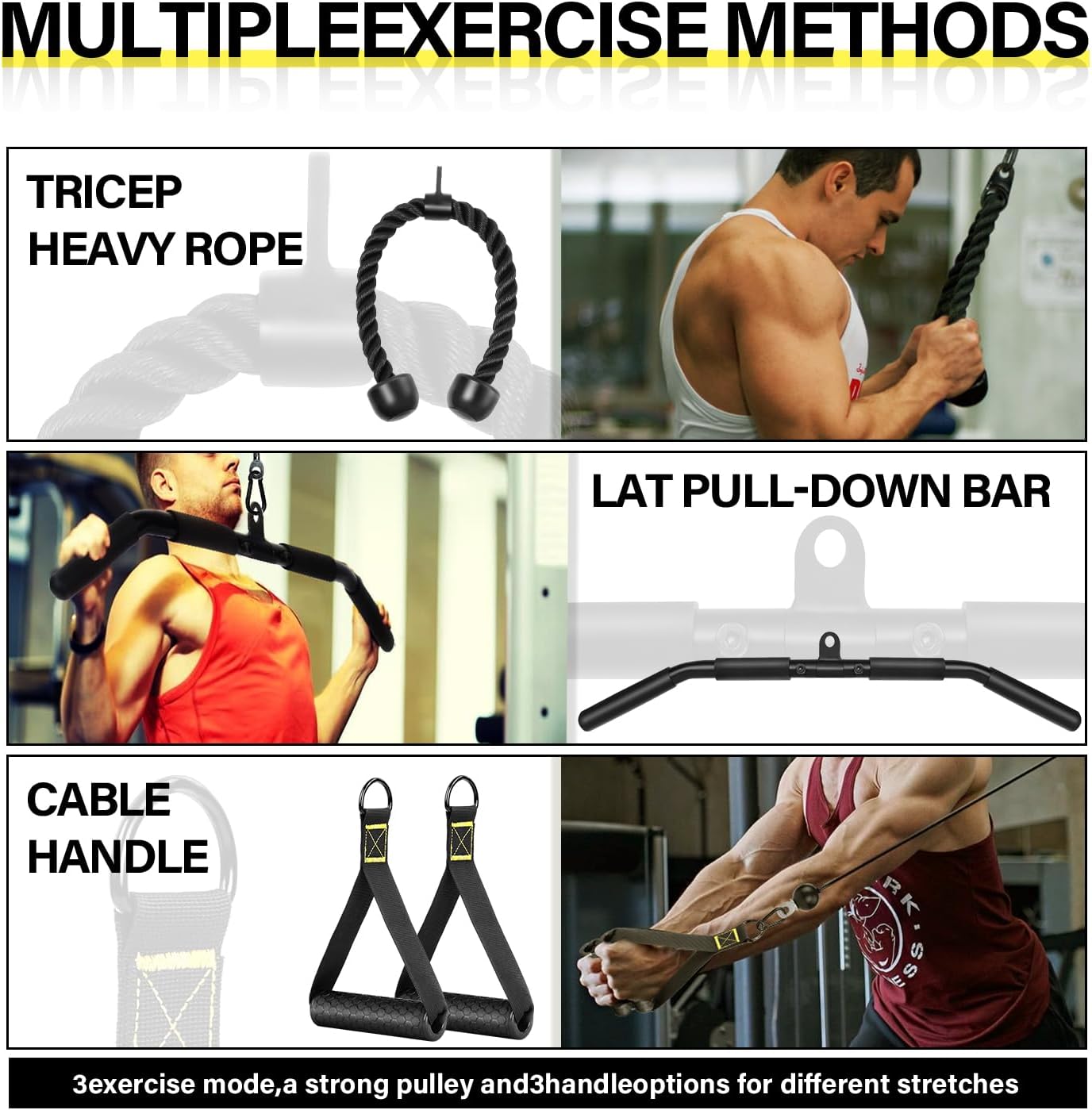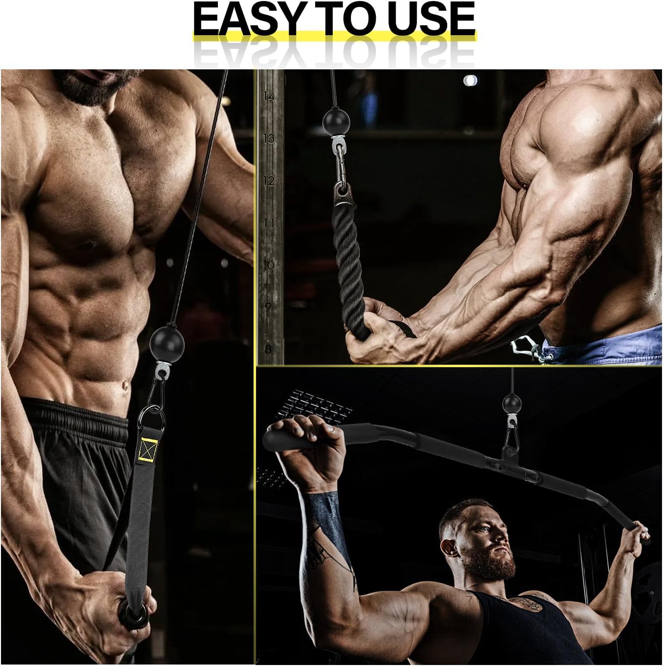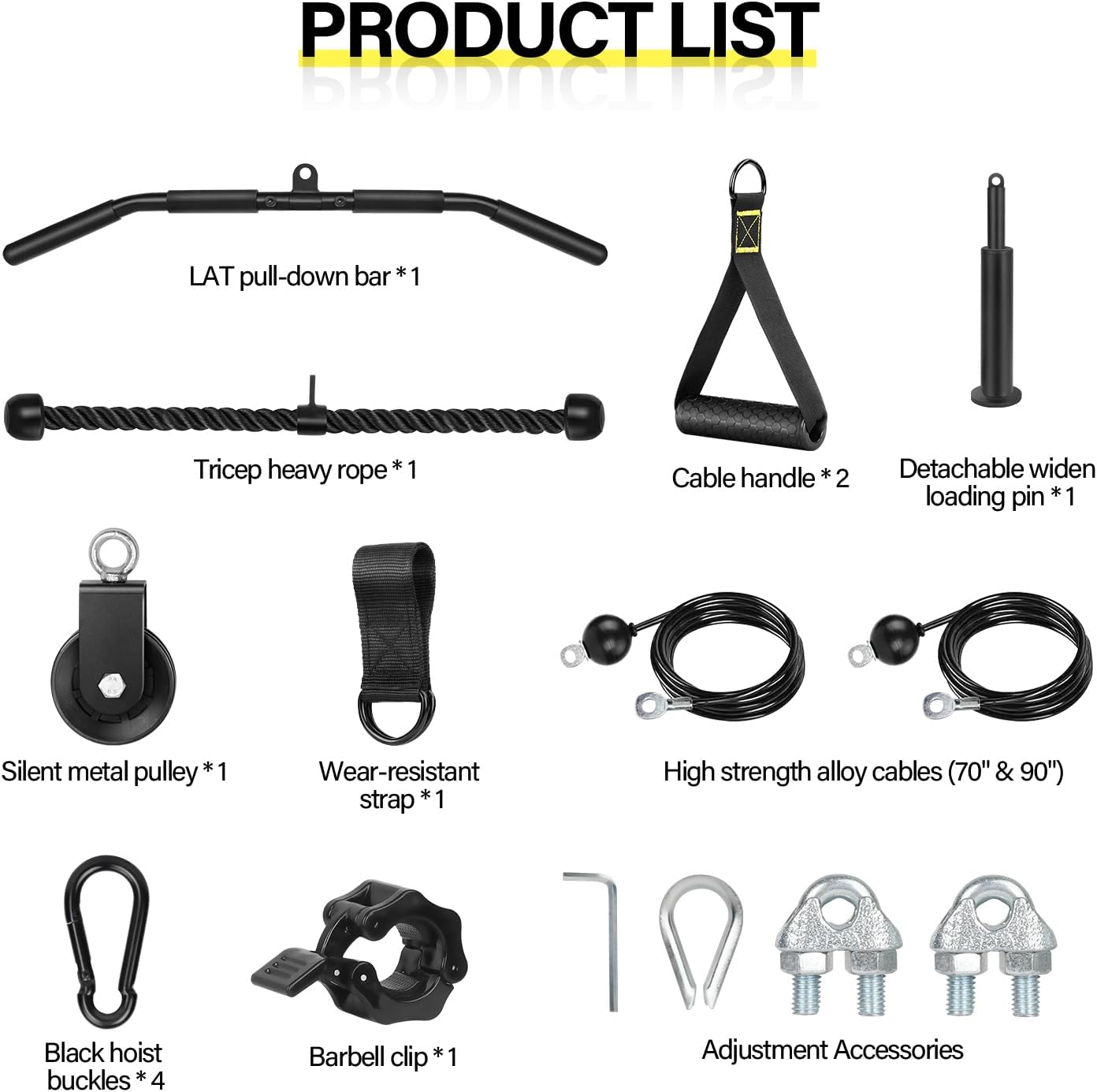 【Merchandise Embody】: 1 x Tricep heavy rope; 1 x LAT pull-down bar; 2 x Train Handles; 1 x Silent steel pulley; 1 x Removable widen loading pin; 2 x Excessive power alloy cables (70″ & 90″); 1 x Barbell clip; 1 x Put on-resistant strap; 4 x Black hoist buckles; 4 x Adjustment Equipment
