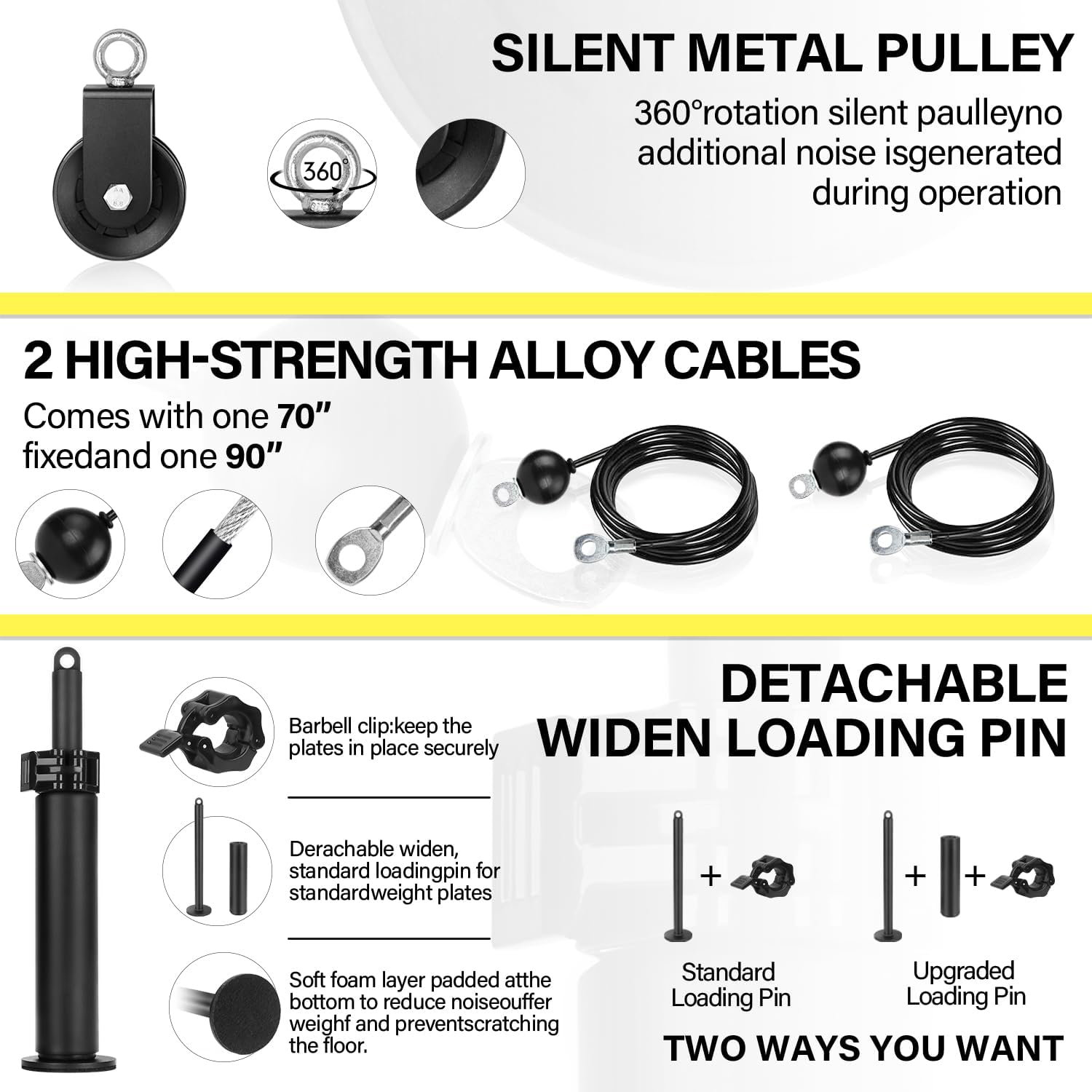 【Sturdy & Skilled Design】: The upgraded loading pin is manufactured from thicken metal, the underside elevated sponge to make sure your ground from harm. 360° rota-table silent pulley, guaranteeing noiseless, stability and smoothness throughout use. Comes with two sizes(70″ & 90″) high-level cable to satisfy your varied train methods
