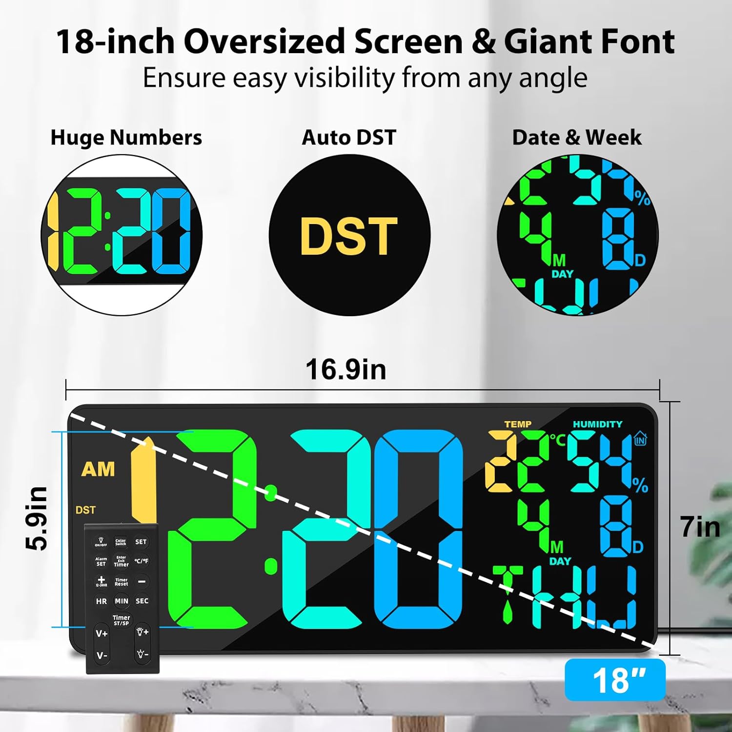 【Wealthy Show & Straightforward Readability】- The 18-inch outsized high-definition LED display screen not solely shows the time but in addition offers info such because the DST, day, date, and temperature/humidity. The 5.9-inch excessive distinction font ensures visibility from any angle, making it superb for people with visible impairments or poor eyesight.