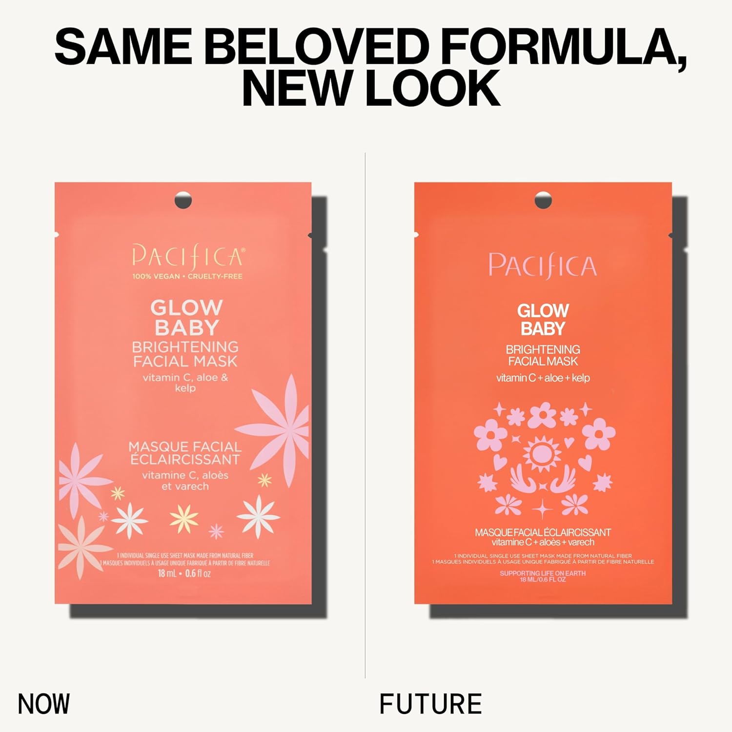 GLOW BABY BRIGHTENING FACE MASK is a hydrating & brightening serum-soaked sheet masks that hugs the face to assist struggle dullness and darkish spots with vitamin C, aloe, and kelp.
