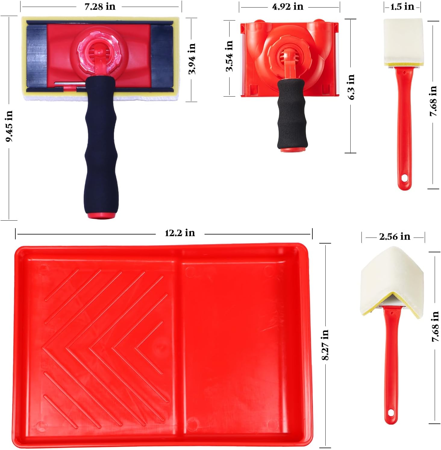 10-piece paint edger set: consists of 7-inch paint trim edger Pad, 360 ° rotating paint edge trimmer, 1-inch Mini trim pad , V- nook painter pad, 7-inch spill-proof compact paint tray, and 5 refill pads.Not embrace extension poles.