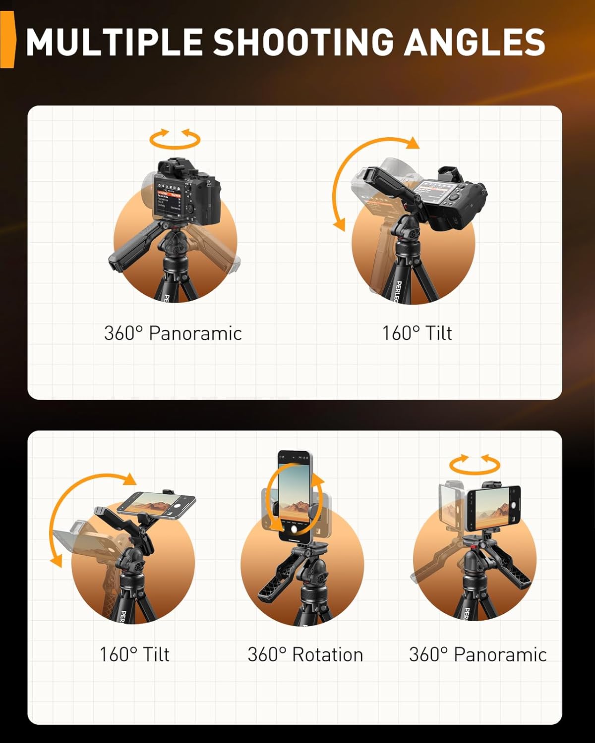 Multi-Angle Photographs: The skilled tripod permits digicam and telephone 360° panoramic and 160° tilt taking pictures for final photographic & cinematic flexibility. The telephone holder additionally rotates 360° to any orientation.