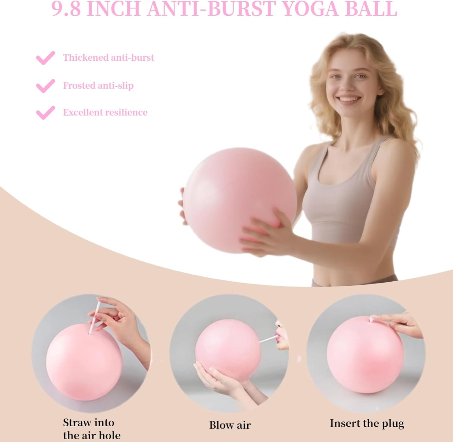【Skilled-Grade Pilates Ring & Ball System】Pilates tools package with diameter of 12″ pilates ring bolstered composite core and plush but supportive cushioning—optimized for multi-positional management.The accompanying 9.8″ anti-burst yoga ball contains a straw for inflating and ultra-grippy textured floor.