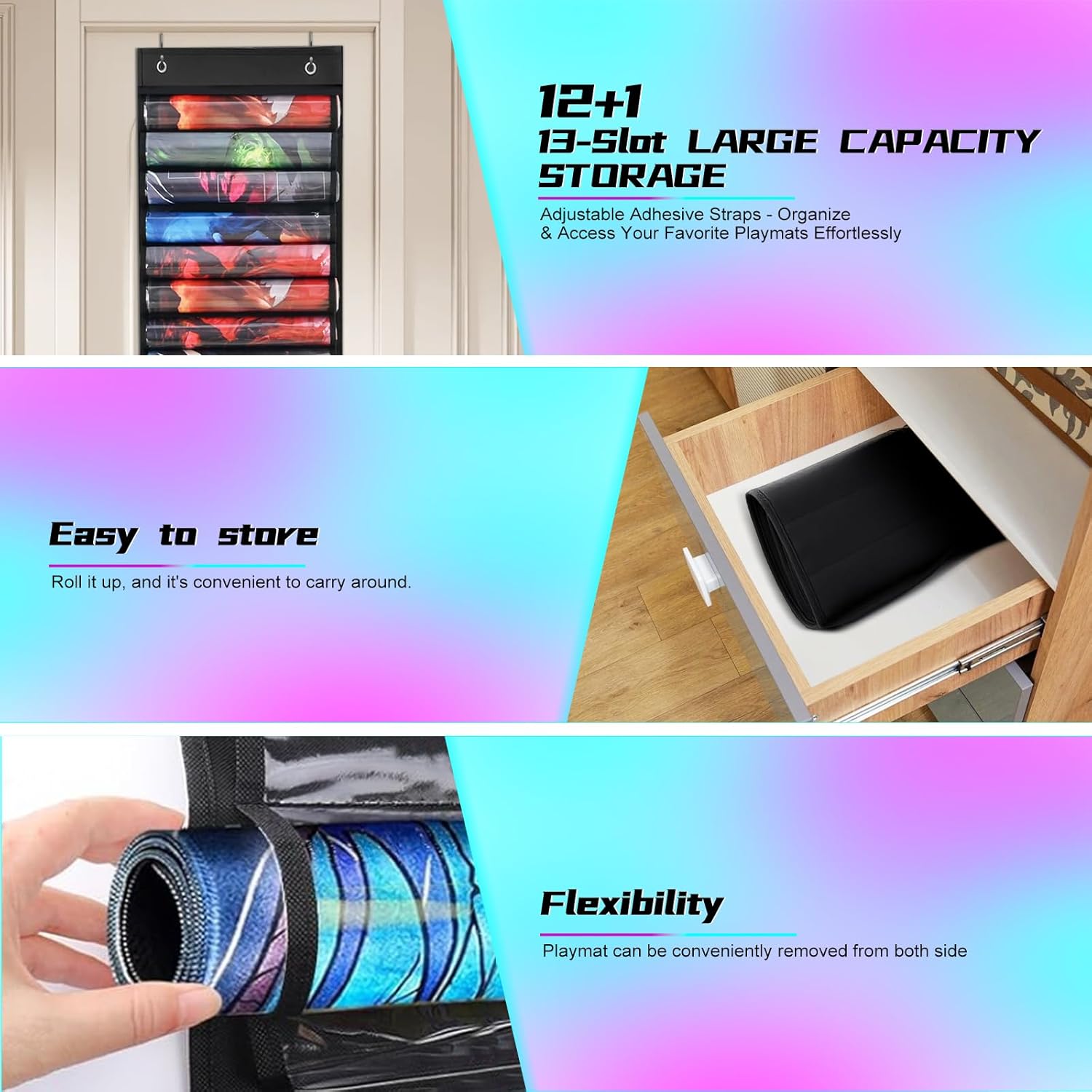 Spacious & Versatile Storage Answer-Showcase your in depth playmat assortment with our giant capability storage bag, that includes 13 slots to carry 12+1 playmats. The adjustable self-adhesive tape permits for simple group and fast entry to your favourite playmats, making it good for each storage and show. The bolstered backside Velcro strip retains your mats safe and neatly stacked.