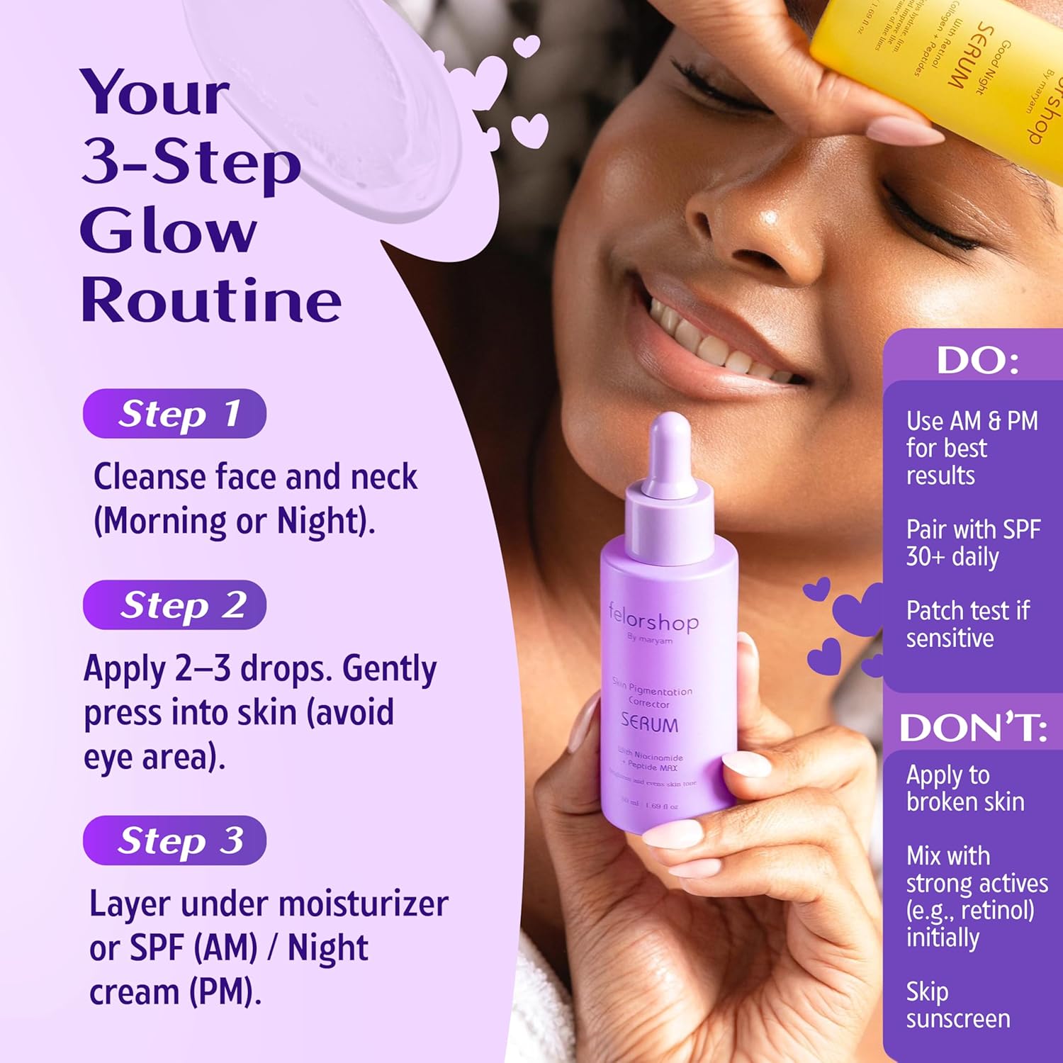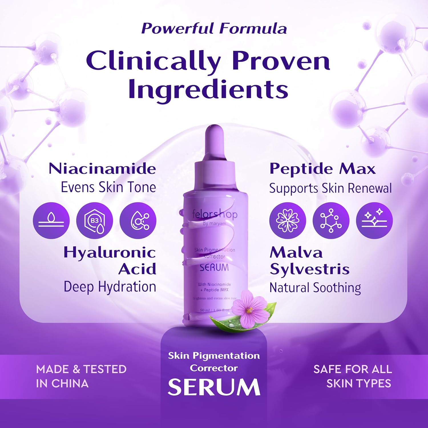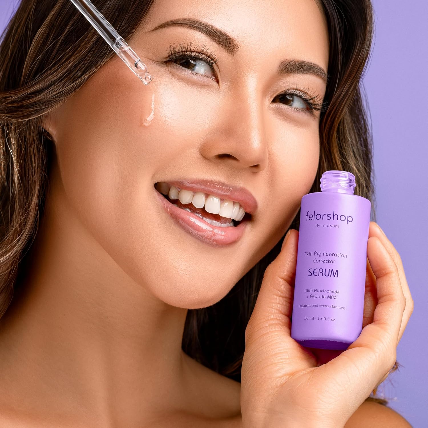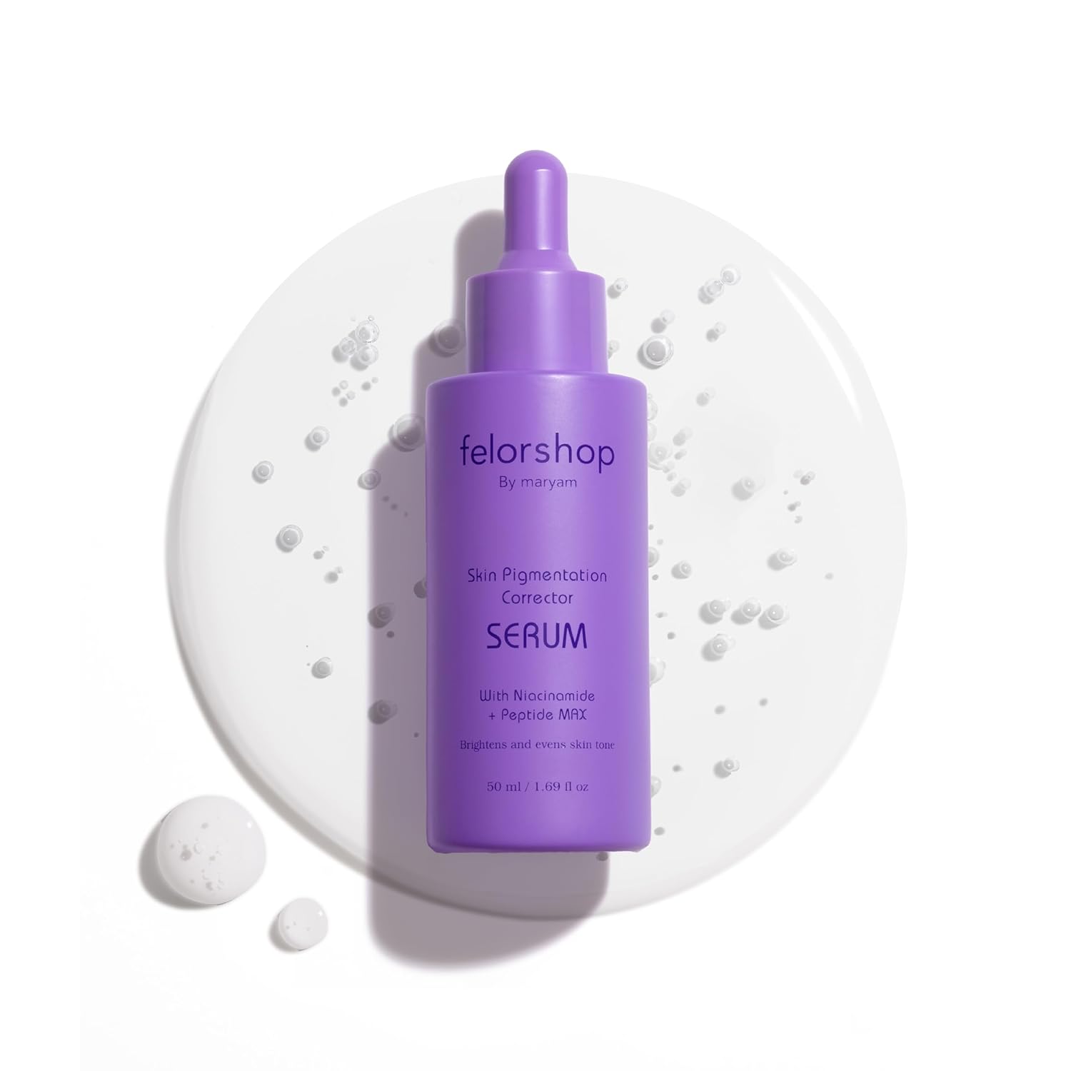 Felor Skin Pigmentation Corrector Serum — purple bottle shown on violet backgroundFelor Skin Pigmentation Corrector Serum — purple bottle shown on violet background