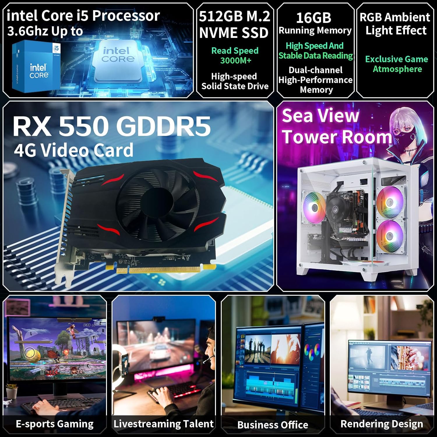 Gaming PC Desktop Pc,Intel Core i5 Desktop,Working at A Frequency of three.2-3.6 GHz,RX550 Graphics Card with 4GB GDDR5 Video Reminiscence,16GB RAM, 1TB NVME SSD,WiFi 5.0,RGB Fan x4