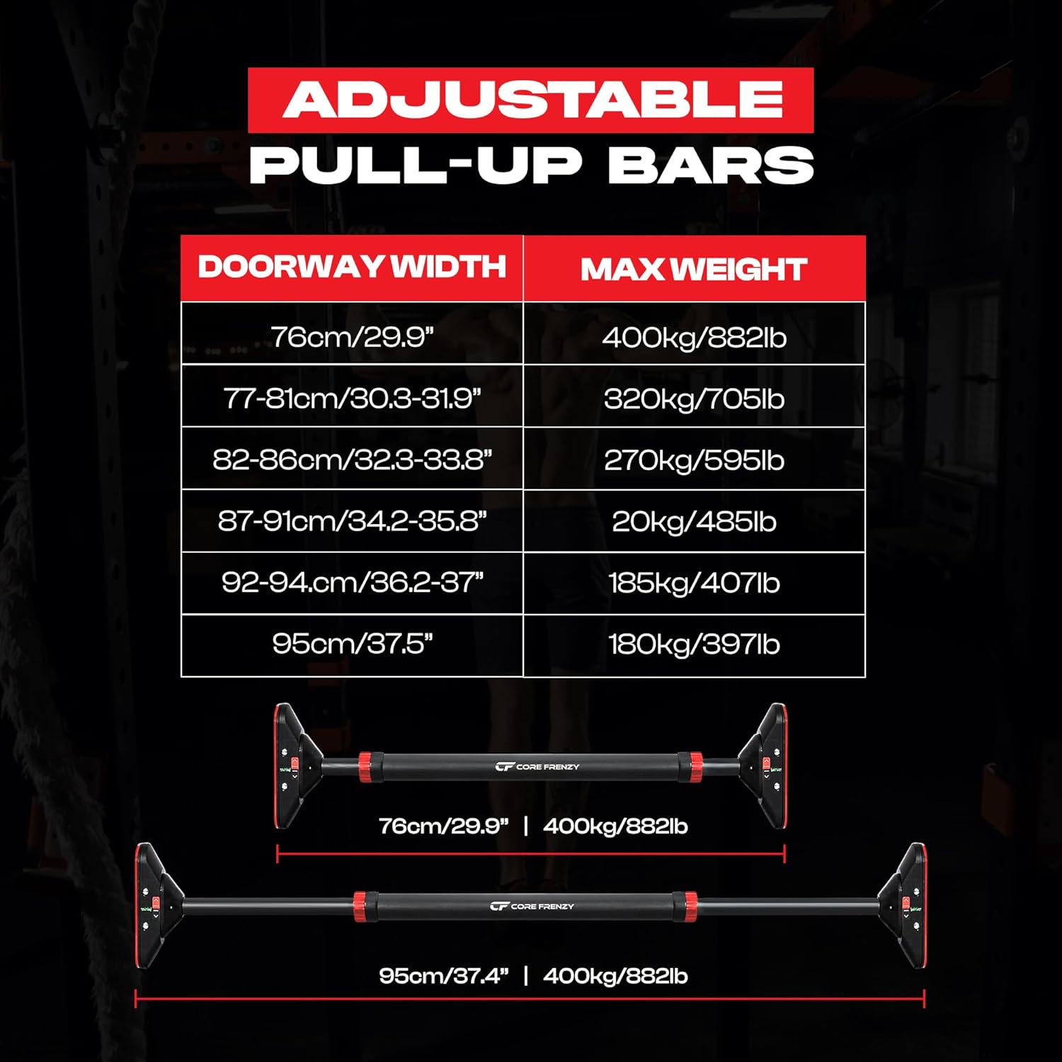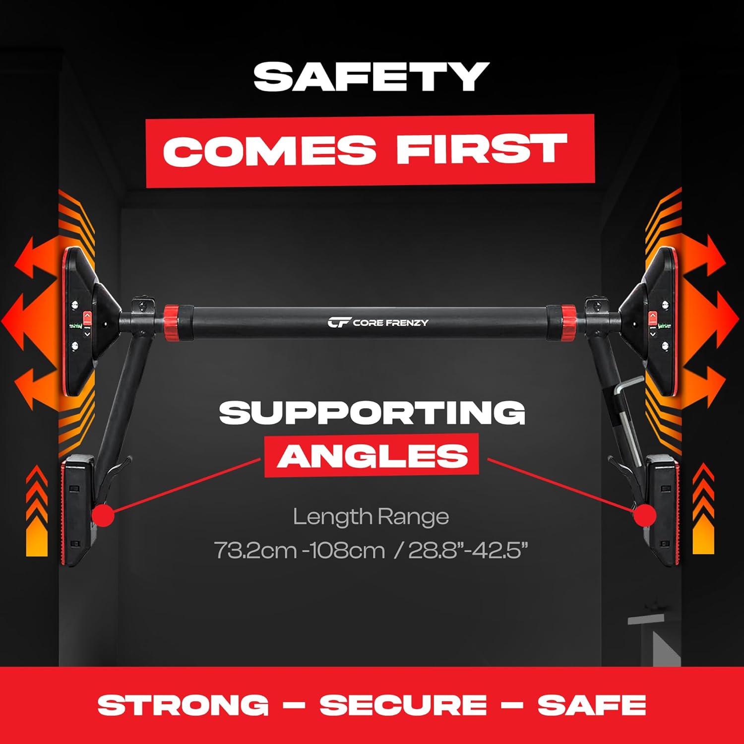 🔧 ADJUSTABLE & UNIVERSAL FIT: Designed to suit most door frames, the Core Frenzy Pull-Up Bar extends from a compact 29.9″ to an extra-wide 37.5″. Whether or not you are doing chin-ups or wide-grip pull-ups, this bar adjusts to your area—no instruments or screws required.
