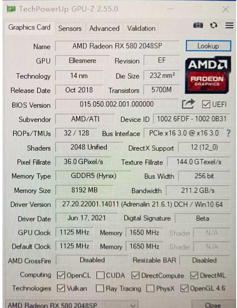GPU AMD Radeon RX 580 Stream Processors 2048 SP GPU Clock 1125 MHz Reminiscence Clock 6600 MHz (1650Mhzx4) Reminiscence Measurement 8GB Reminiscence Sort GDDR5 Reminiscence Interface 256 bits Interface PCI Specific 3.0×16 ROPs/TMUs 32/128 Bandwidth 211.2 GB/s Show Output DVI-D,HDMI,DP 3D API DirectX 12/Vulkan/OpenGL 4.6 Computing OpenCL/DirectML/DirectCompute TDP 150W PSU 450W System Help Home windows 11/Home windows 10 /7/Ubuntu x86 /Linux x86
