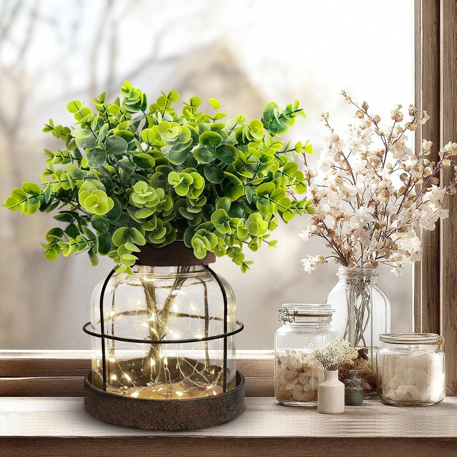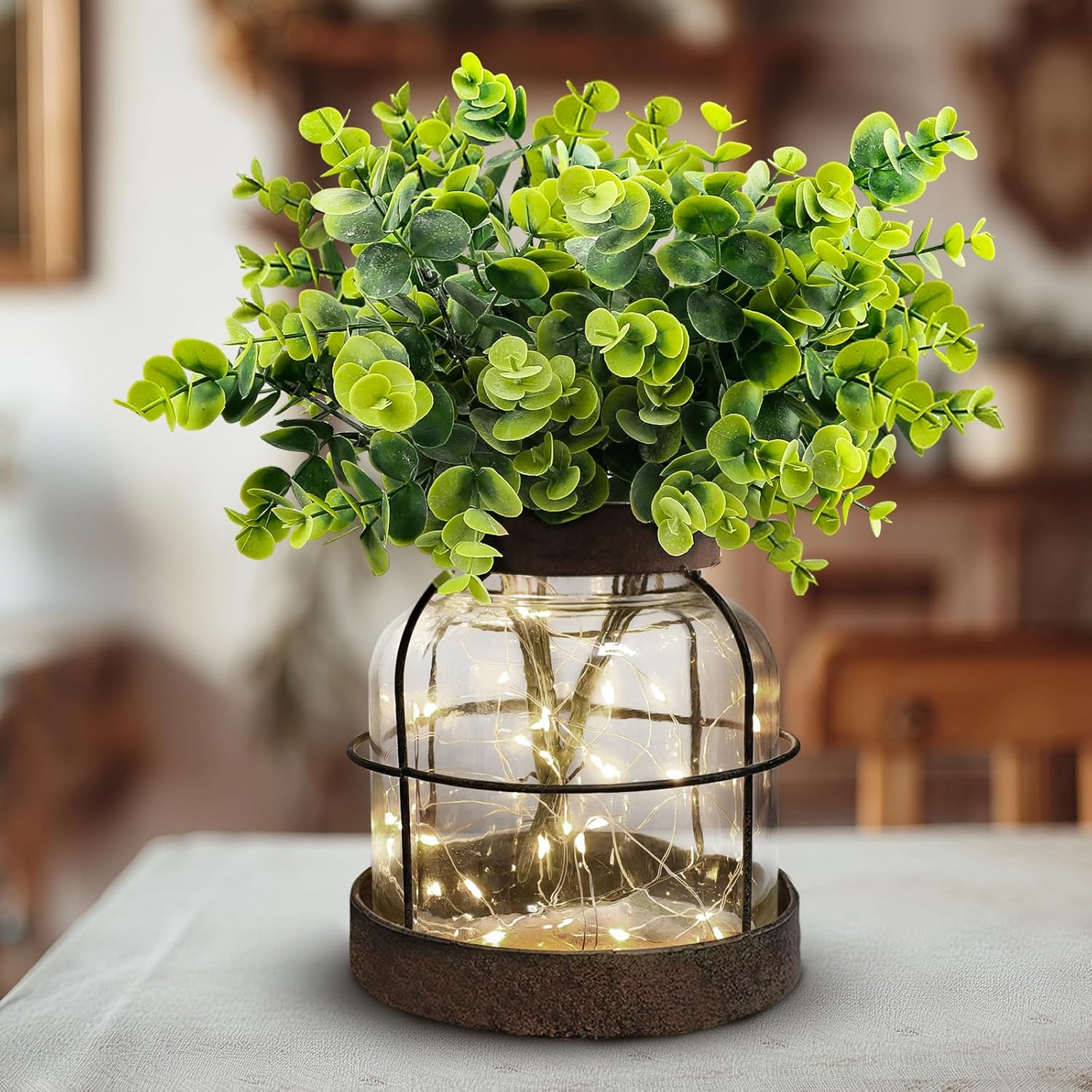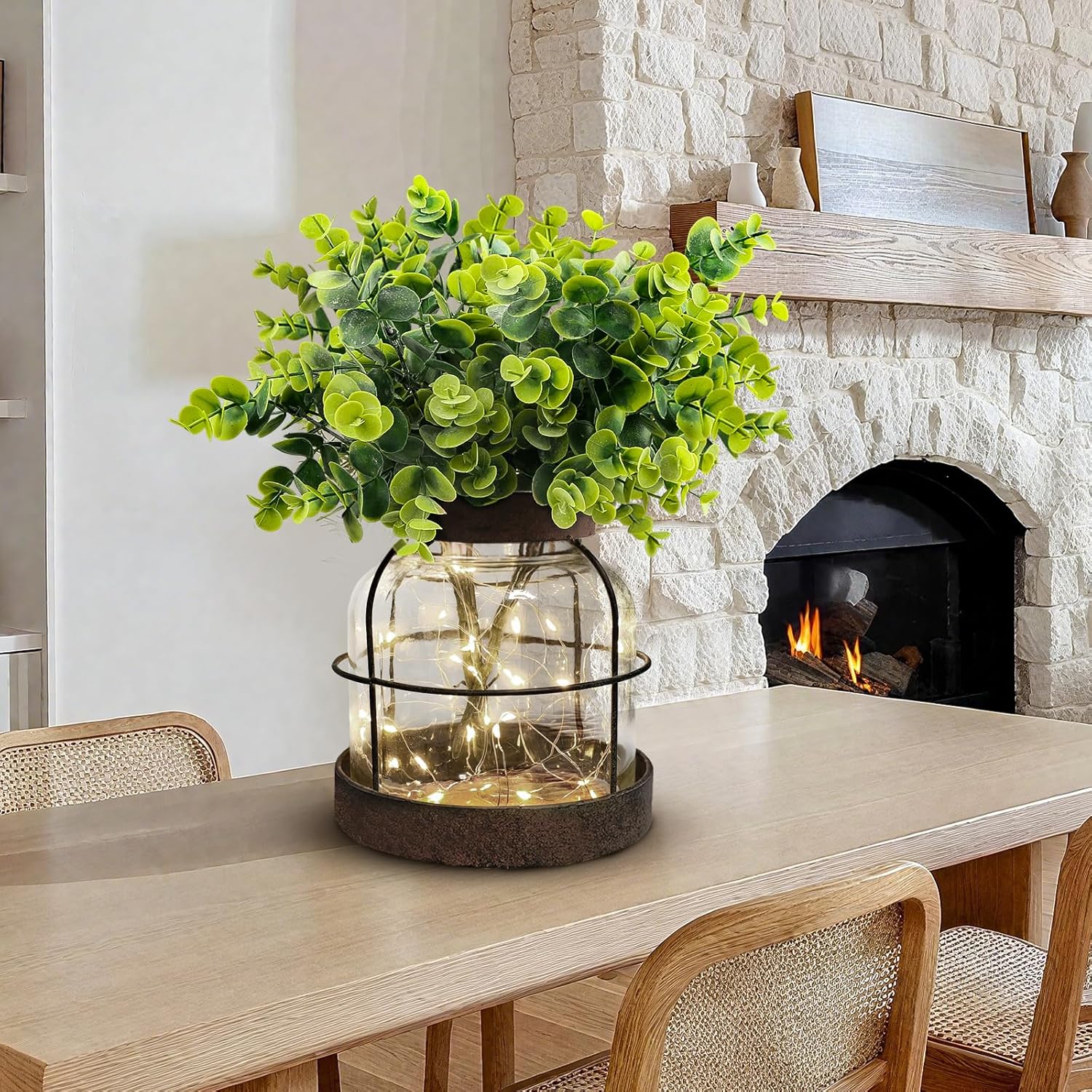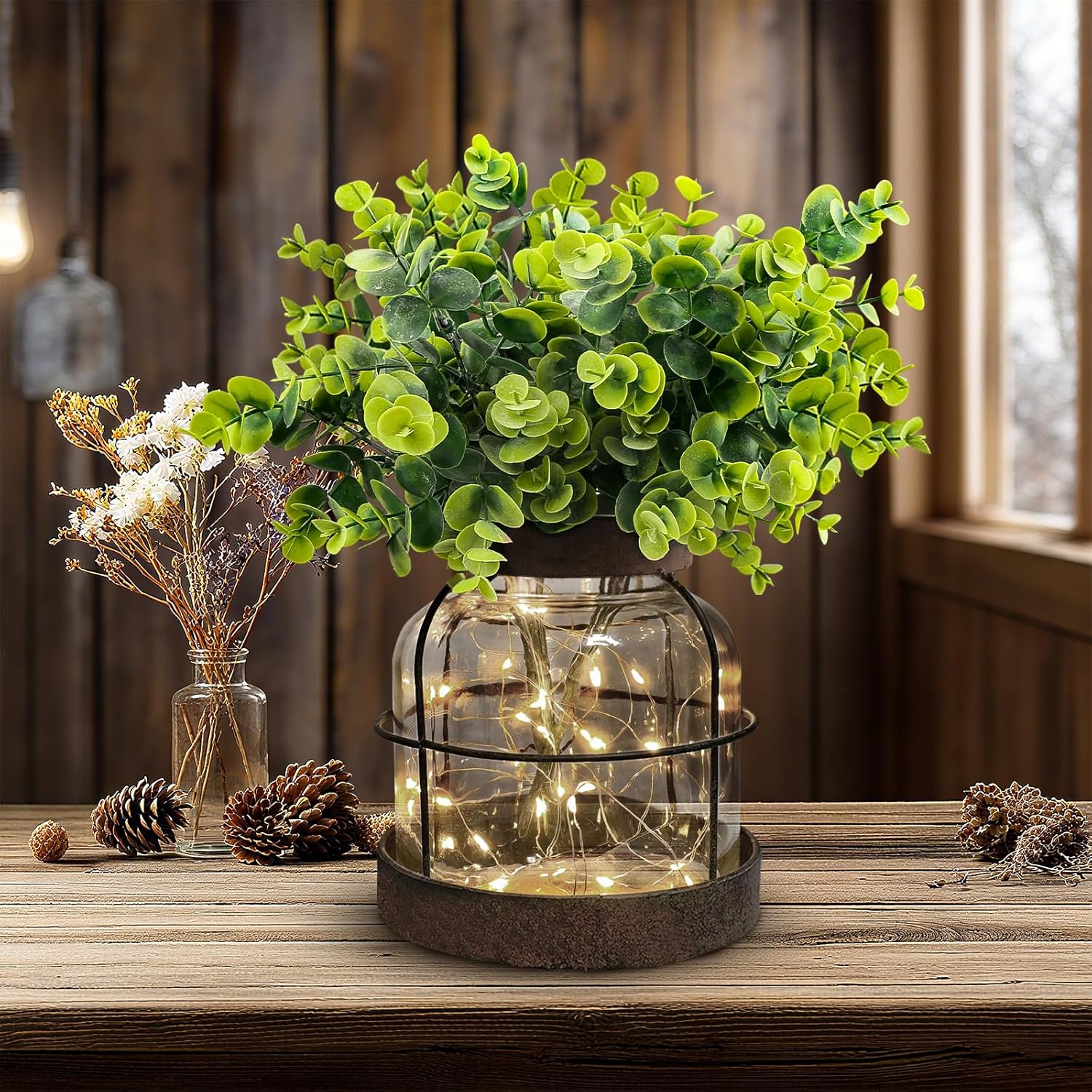 Farmhouse Vase: The classic vase has clear jar, rustic model body and steel deal with, together with synthetic Eucalyptus greenery and 13.12FT string lights (batteries not included), which can create nation model to your private home