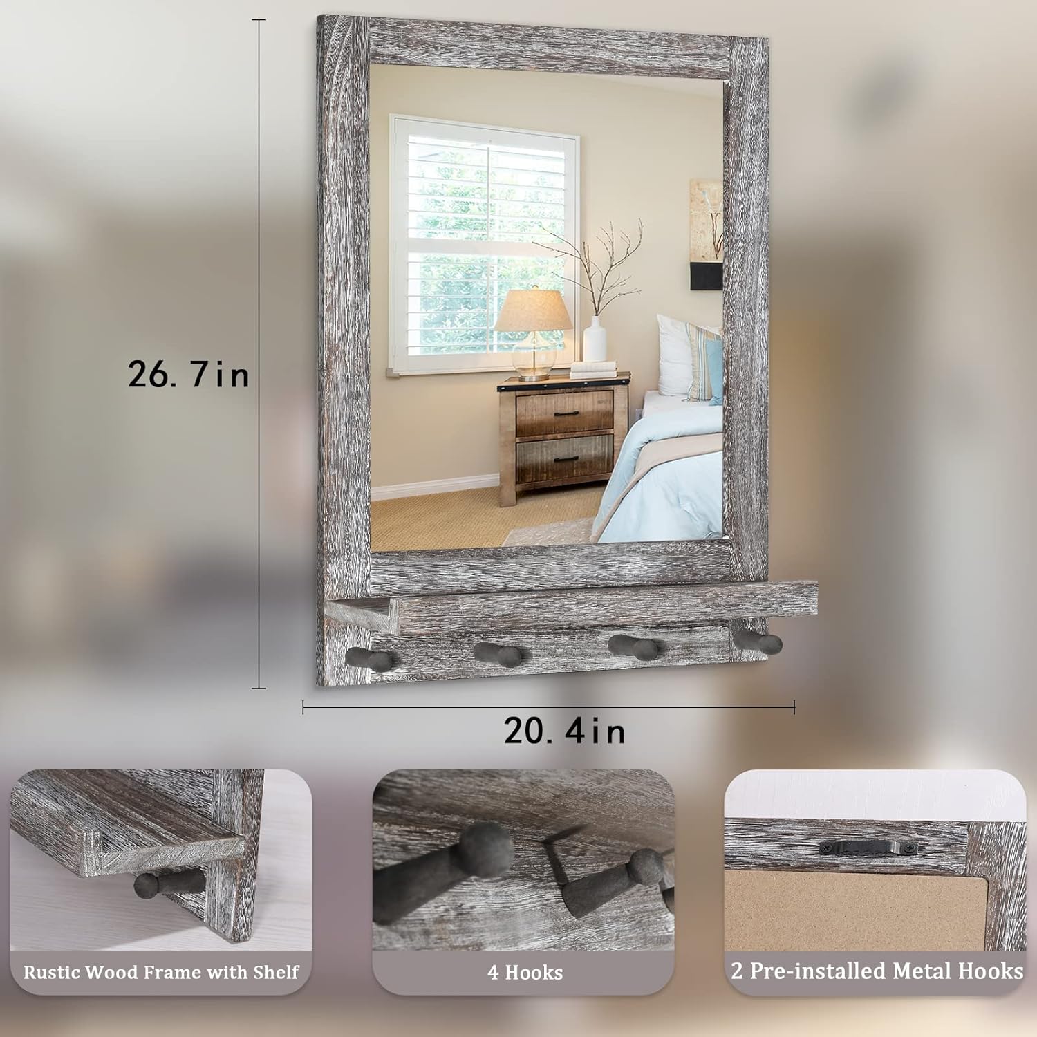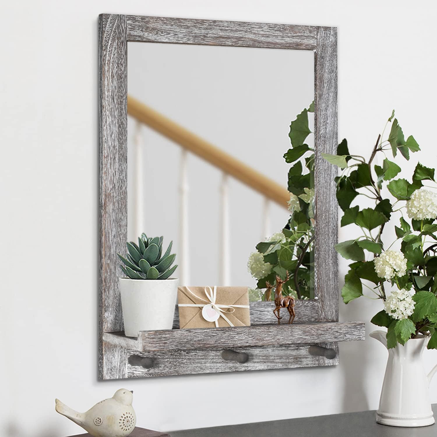 Sturdy and Sturdy:The mirror with shelf is manufactured from wood body, hooks and high-quaility galss which give a clearer and actual imageis,and the glass mirror is firmly secured,embedded within the body and strengthened with strong backing for added stability