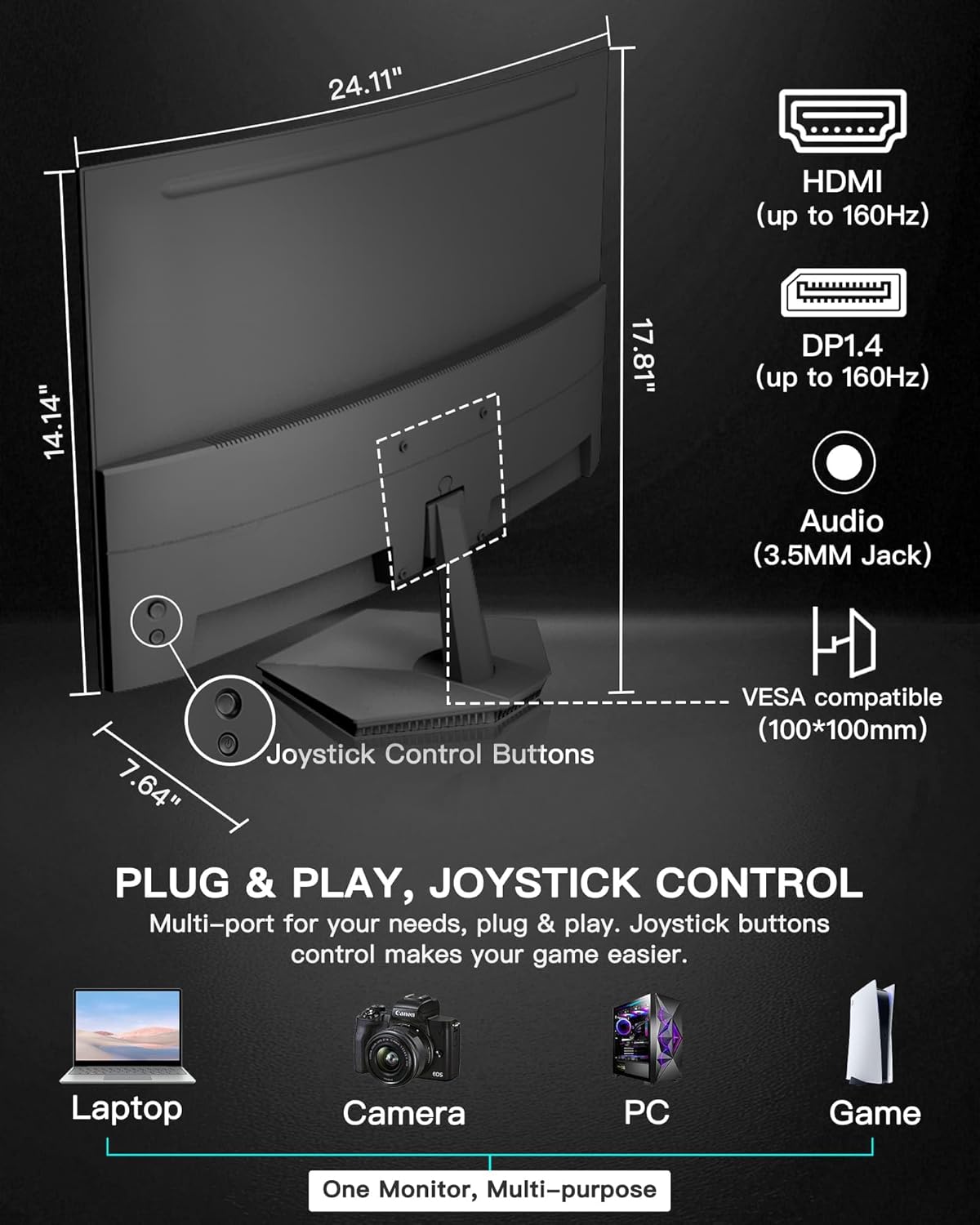 Jacks: HDMI 2.0(160Hz max), DP 1.4(160Hz max), Audio Jack(No Audio system) | VESA 100x100mm | Tilt (-5°~15°±2°).