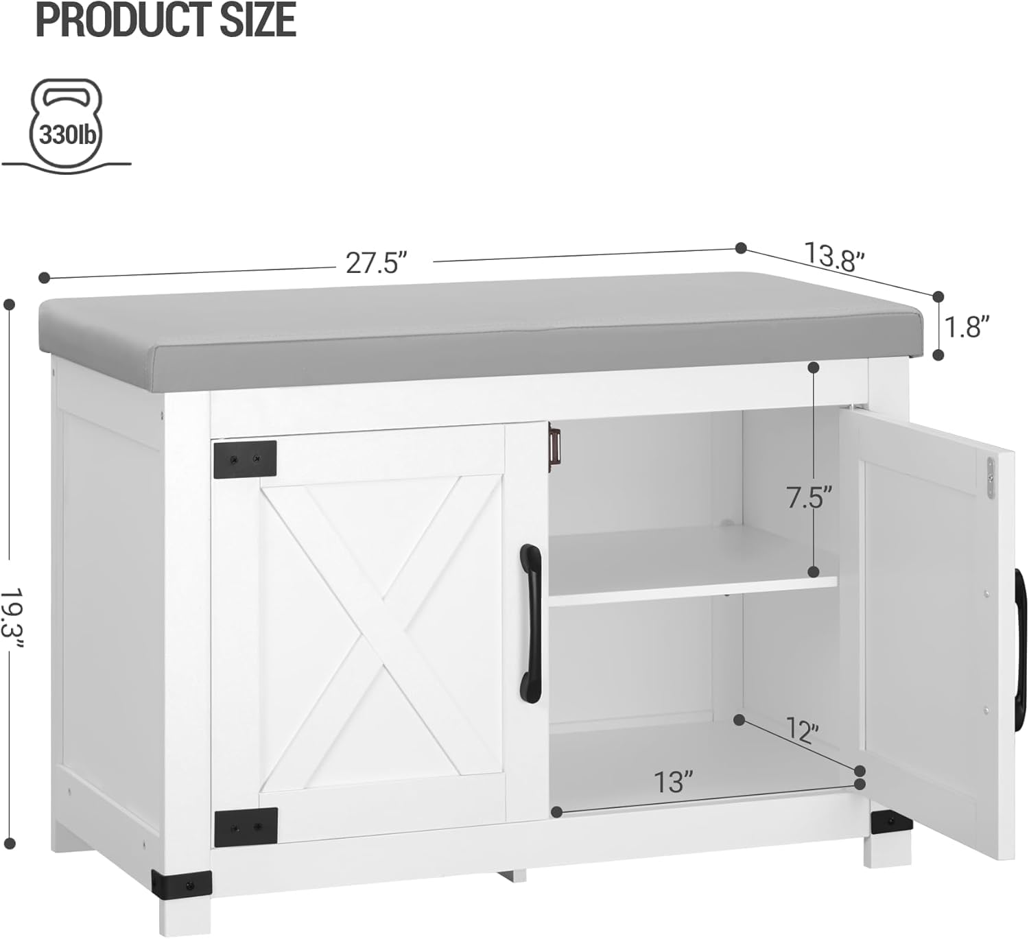 Coloration: WhiteMaterial: Particle board, sponge, PUProduct Dimension: 13.8″D x 27.6″W x 19.3″H (35 x 70 x 49 cm)Complete Weight: 29.1 lb (13.2 kg)Max. Static Load Capability: 330 lb (150 kg)
