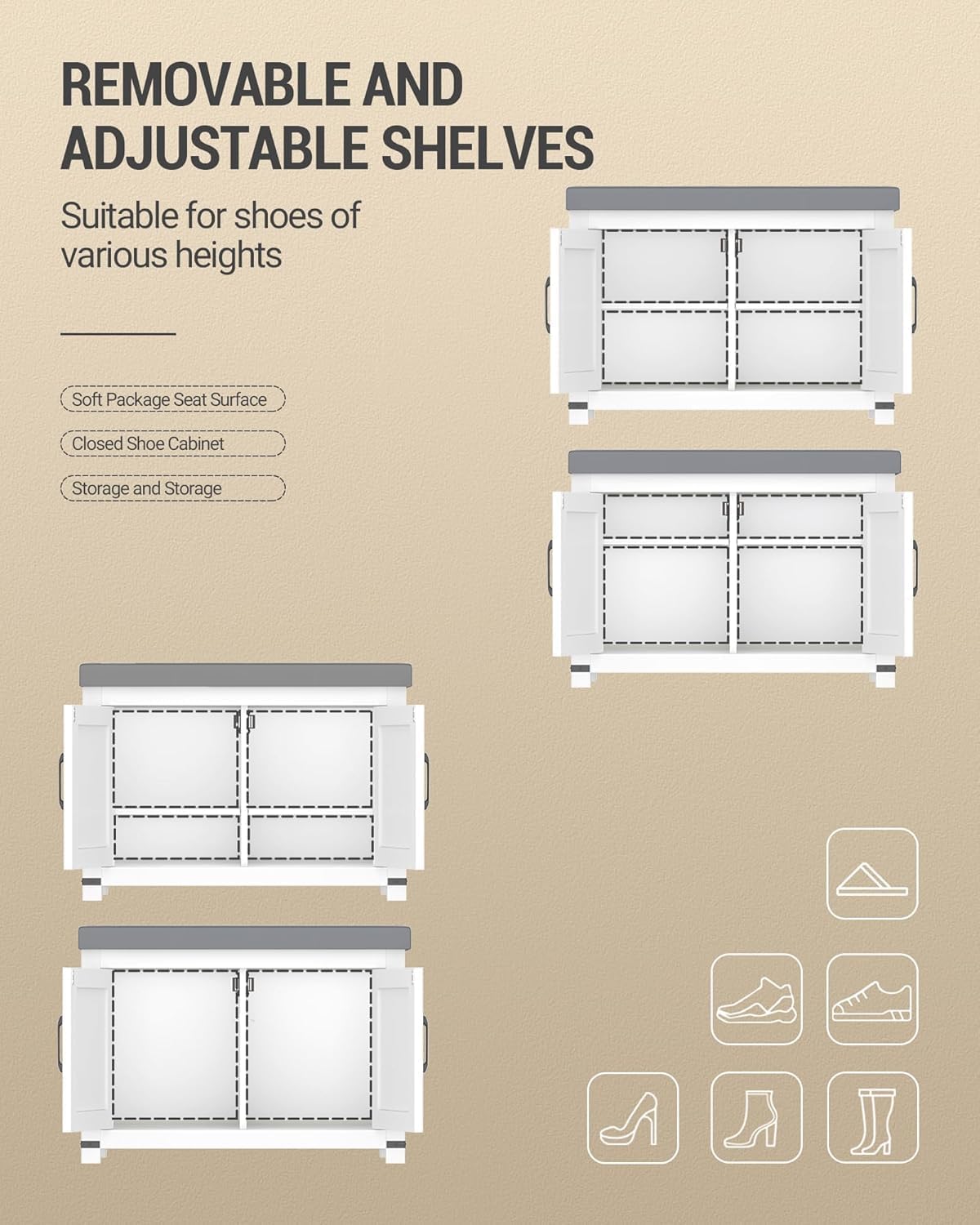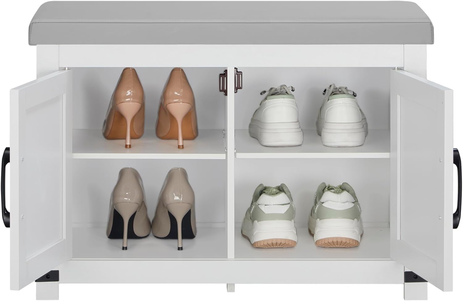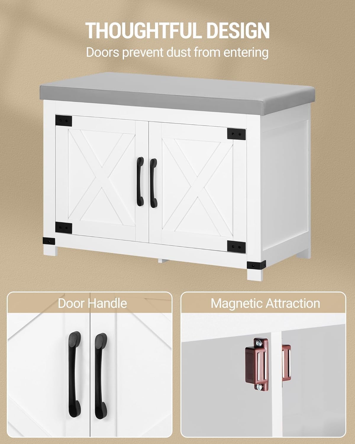 [Space Saving Shoe Bench] This shoe bench is 13.8″D, two barn doorways to guard footwear from mud or pet harm. By adjusting the exercise board within the center, footwear of various heights will be positioned, appropriate for small areas resembling entrances, corridors, and cloakrooms