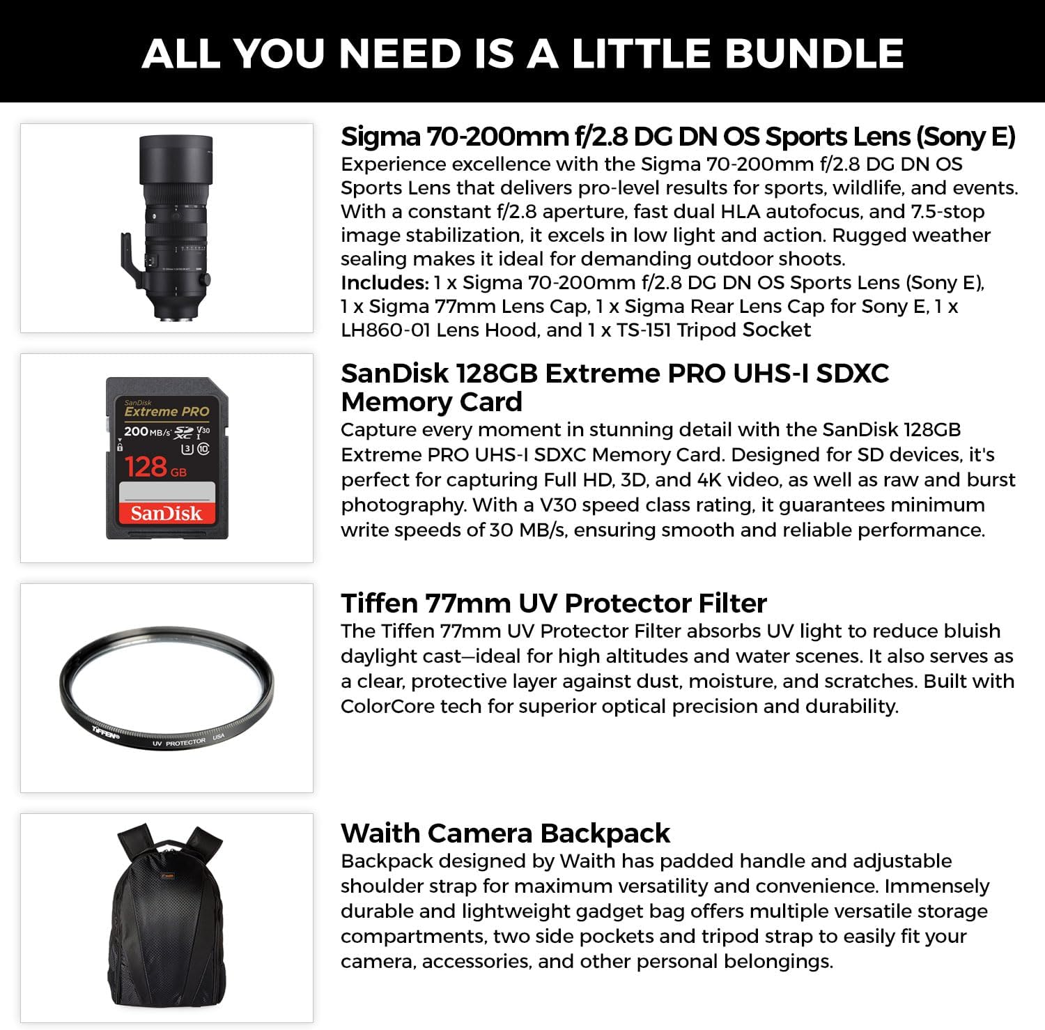 Bundle Consists of: 1 x Sigma 70-200mm f/2.8 DG DN OS Sports activities Lens for Sony E, 1 x Sigma 77mm Lens Cap, 1 x Sigma Rear Lens Cap, 1 x LH860-01 Lens Hood, 1 x TS-151 Tripod Socket, 1 x SanDisk 128GB Excessive PRO UHS-I SDXC Reminiscence Card, 1 x Tiffen 77mm UV Protector Filter, 1 x Waith Backpack.