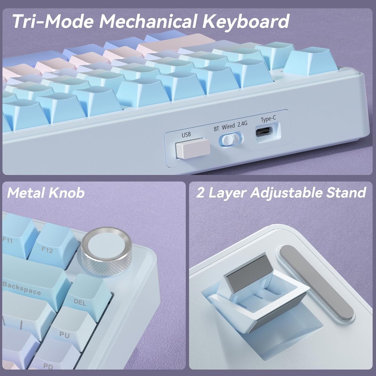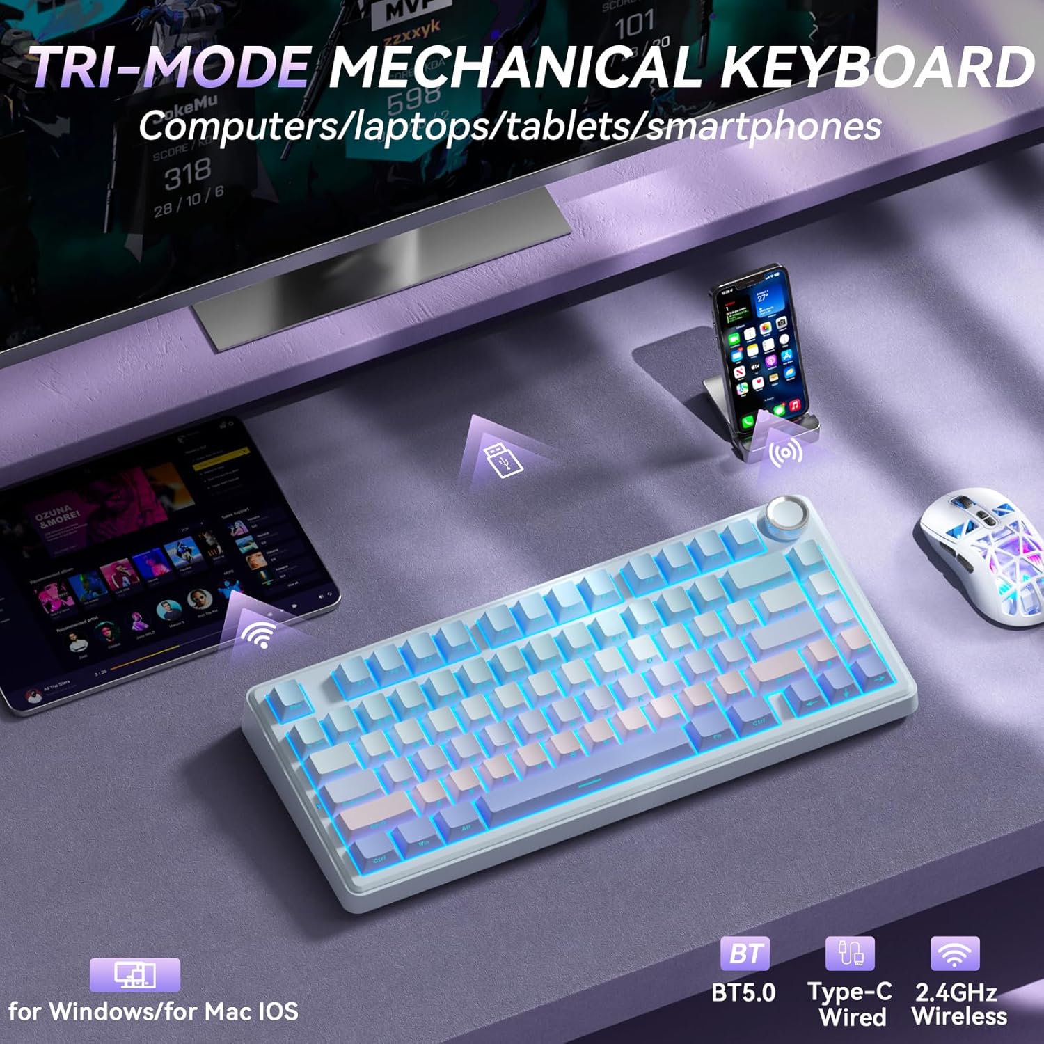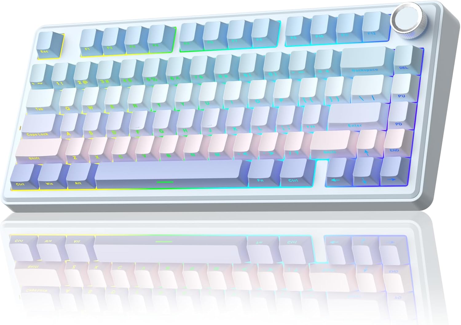 Compact Keyboard with Multifunctional Steel Knob: This 75 p.c keyboard contains a compact 81 keys whereas retaining important gaming arrow keys. It saves useful desk area and affords portability. And it geared up with a multifunctional rotary knob, it switches between gaming and workplace modes. In gaming mode, a brief press selects lighting patterns, whereas rotating adjusts brightness. In workplace mode, a brief press controls multimedia playback and pause. Rotating the knob adjusts the amount