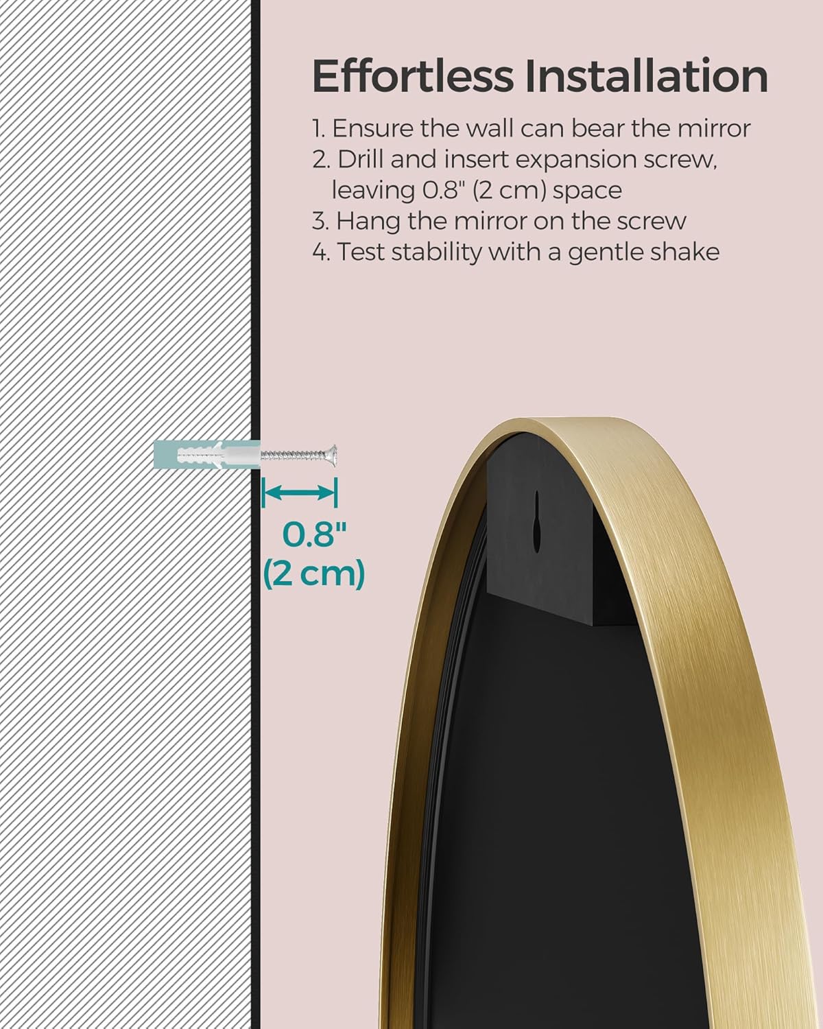 [Installation? A Breeze] All you want is to pop in a single enlargement screw, and this elegant circle mirror will likely be gracing your wall. However keep in mind, do not skip the directions. We would like your mirror to be as secure as it’s beautiful!