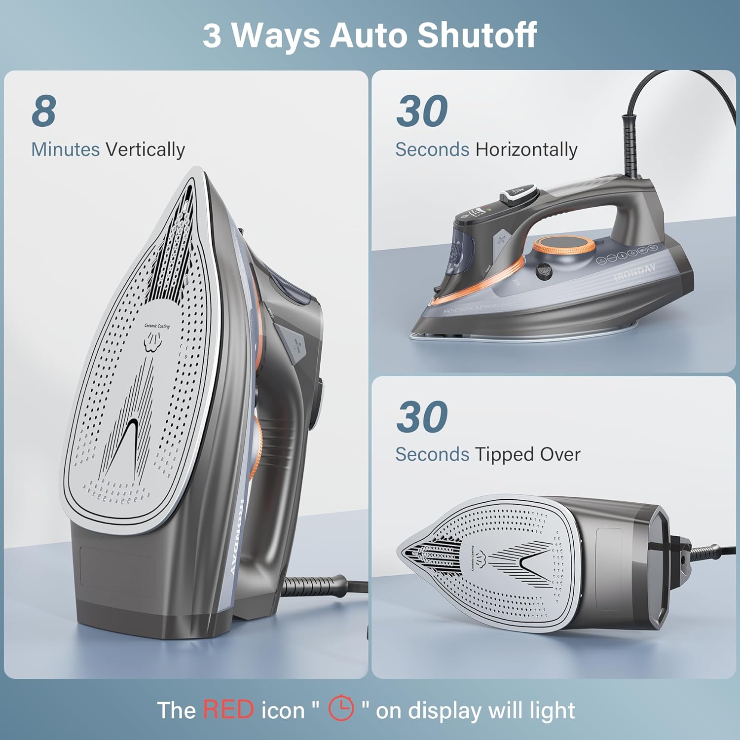 [Safe 3-Way Auto Shutoff] Enhanced safety and peace of mind with the 3-way auto shutoff feature. The iron automatically switches off after 30 seconds when placed horizontally, 30 seconds when placed on its side and 8 minutes when placed vertically, preventing any potential danger