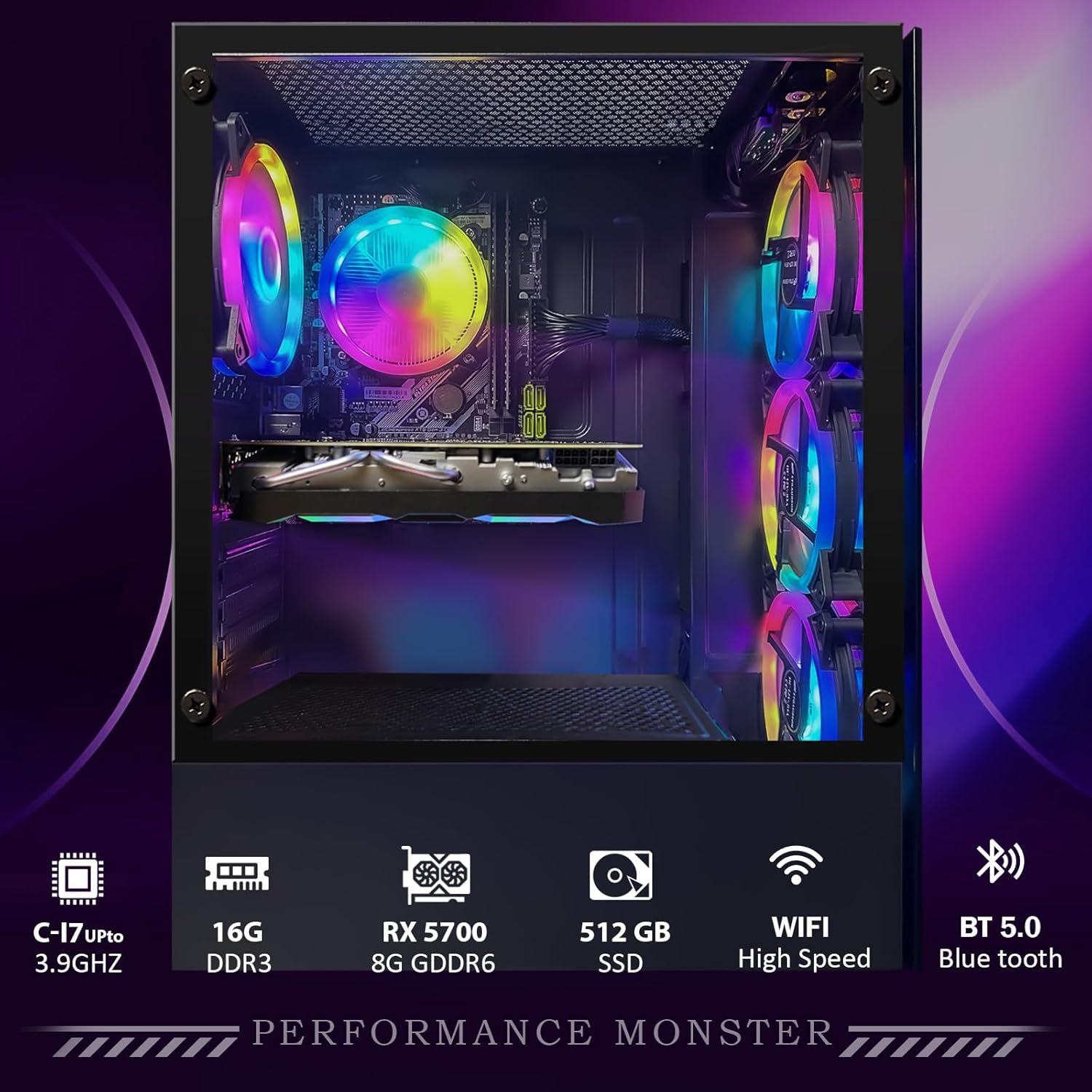 Gaming Desktop Connectivity: This gaming laptop comes with RGB Fan x 4 | 1x RJ-45 | 1x Serial | USB 600M Wi-Fi | USB Bluetooth 5.0 | AMD Radeon RX 5700 8G GDDR6 Video Card | 1x HDMI | 1x DisplayPort | 1x DVI