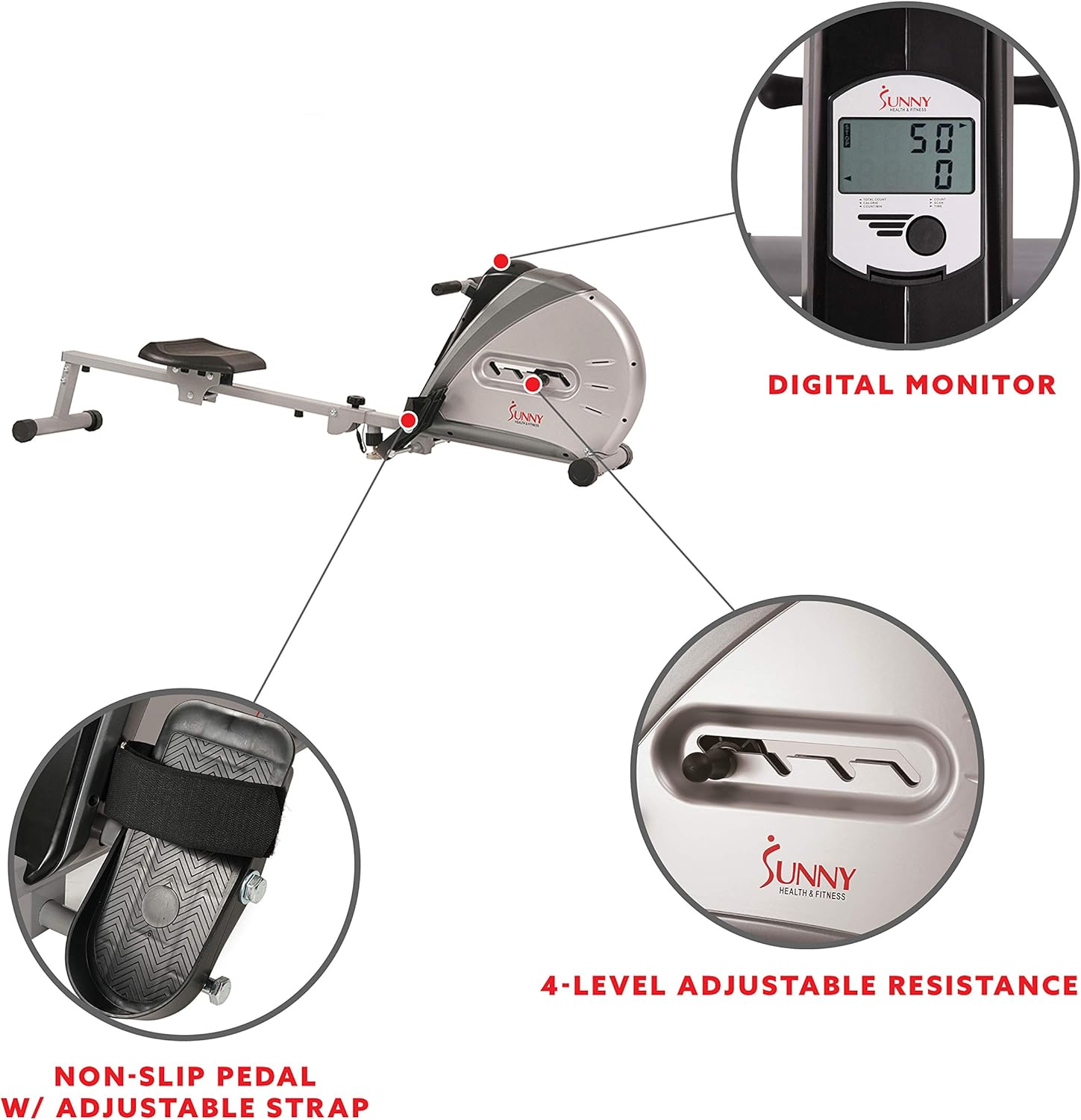 The Sunny Well being & Health SF-RW5606 Elastic Twine Rowing Machine offers an excellent option to improve health by burning energy and constructing muscle in a protected, low-impact means. Fabricated from top-grade metal, this ultra-smooth and quiet rower options an elastic wire resistance with 4 ranges of adjustable pressure which makes it the proper addition to your property gymnasium. It comes geared up with massive any-slip pedals with straps and an easy-to-read LCD monitor which shows Time, Energy burned, Rely, Whole Rely, Rely per minute, and Scan. That includes the choice to fold; the Sunny Well being & Health Elastic Twine Rowing machine could be very transportable and might simply be saved away. Most person weight 220 lb.