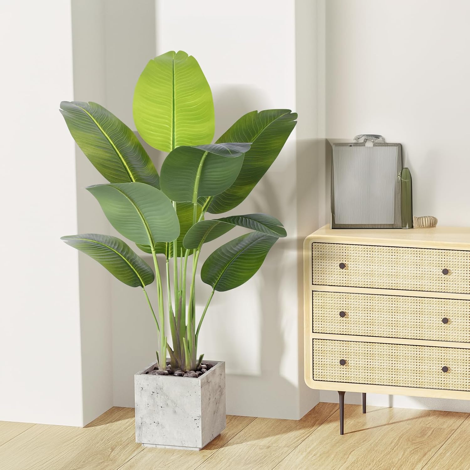 𝐃𝐢𝐦𝐞𝐧𝐬𝐢𝐨𝐧𝐬 & 𝐐𝐮𝐚𝐧𝐭𝐢𝐭𝐲: The synthetic Birds of Paradise plant synthetic tree stands almost 47 inches tall, with a pure peak of 47 inches after spreading the branches and leaves. The white container has a diameter of seven.87 inches and a peak of seven.87 inches. It options 9 giant banana leaves. Suggestions: 1. Unfold the branches and leaves to attain the fullest form and optimum pure peak. 2. The flower planter and dry moss proven within the footage aren’t included within the product bundle. This massive pretend plant is right as a flooring plant or an enormous tree to boost your own home decor