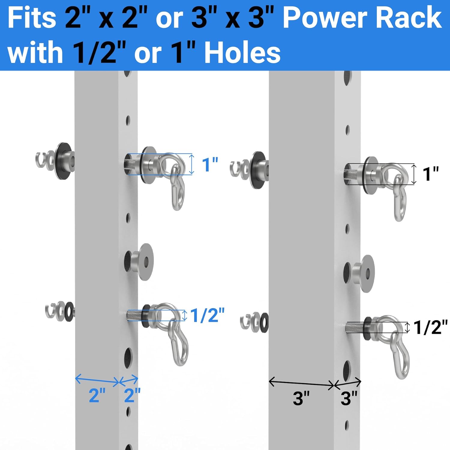 【180° SWIVEL ACTION + MULTI-RACK COMPATIBILITY】Pulleys rotate freely for pure motion arcs. Matches ALL 2×2” or 3×3” racks (1/2” or 1” holes). Excellent for house gyms, energy cages, and squat stands.