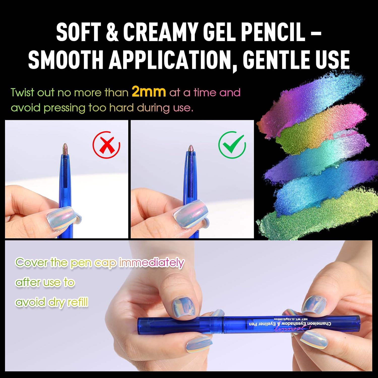 【Comfortable Texture – Use with Care】NOTICE: The gel pencil has a delicate, creamy texture for easy utility. To forestall breakage, twist out not more than 2mm at a time and keep away from urgent too onerous throughout use. For a extra intense impact, apply a black eyeliner base earlier than layering this pencil to reinforce the colour shift. Removes simply with an expert make-up remover.