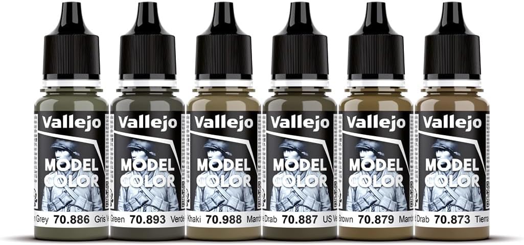The set consists of 6 bottles of 18 ml. (0.60 fl.oz.) of the next colours: 70.886 Inexperienced Gray – 70.893 US Darkish Inexperienced – 70.988 Khaki – 70.887 US Olive Drab – 70.879 Inexperienced Brown – 70.873 US Discipline Drab