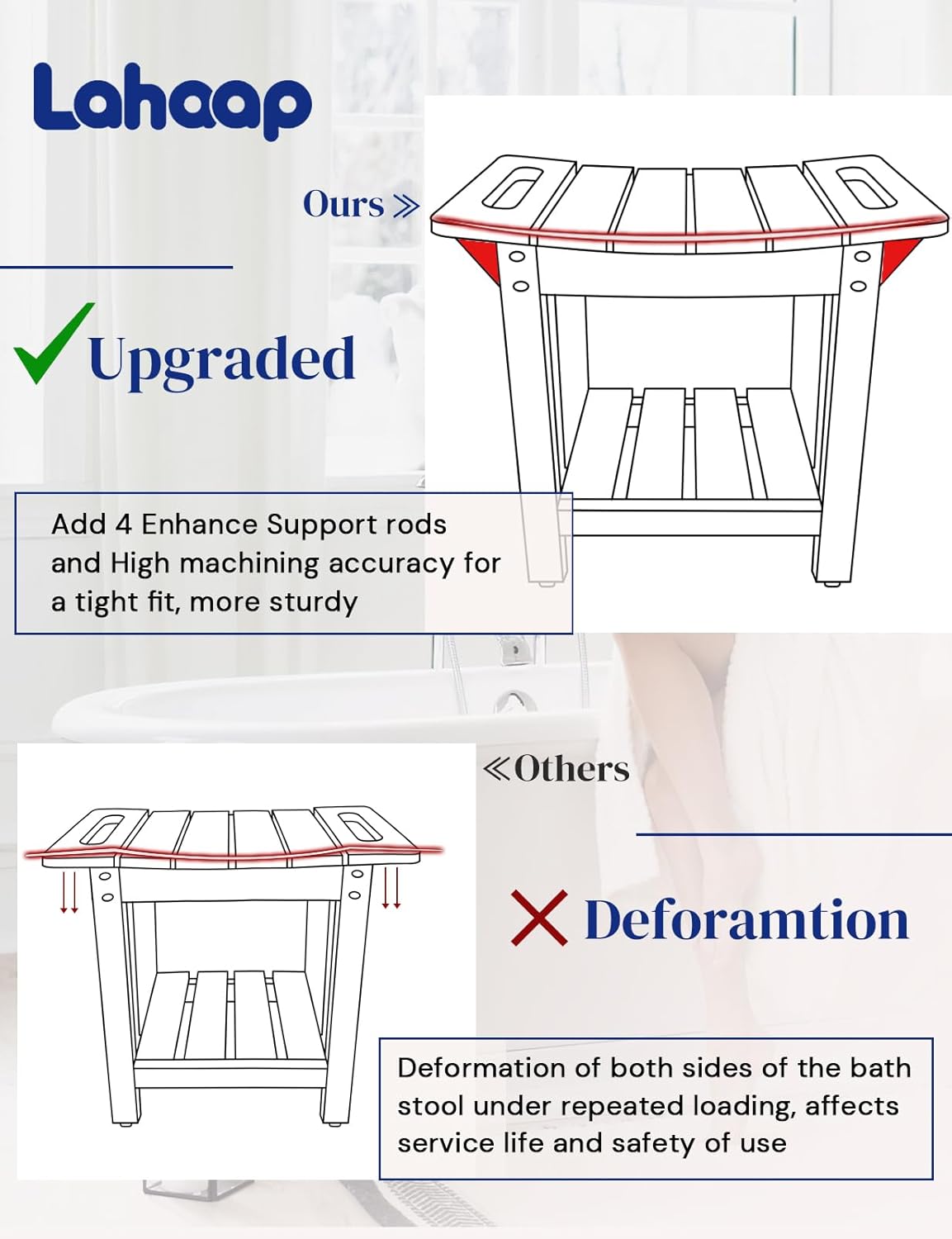 【Holds As much as 400LBS】LAHAAP bathe stools improve stability and sturdiness with sturdy body construction design, bolstered legs and anti-slip pad. Ergonomic curved seat plate for extra consolation.
