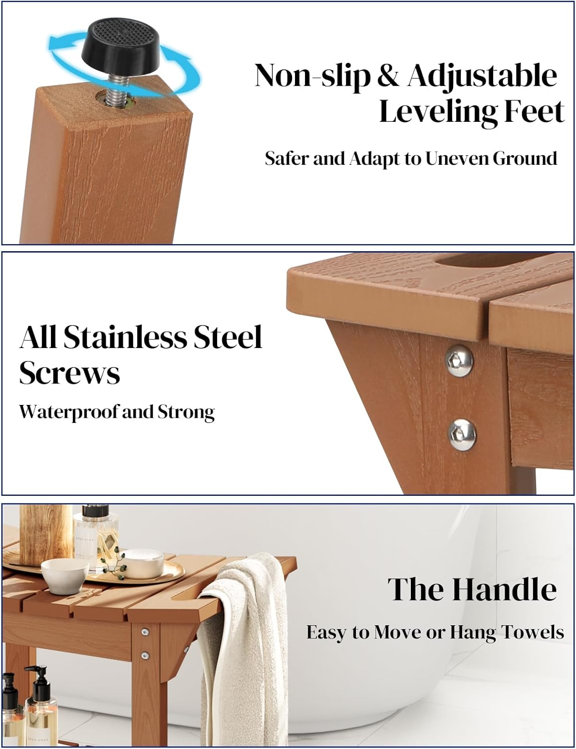 【100% Waterproof】 The bathe bench is manufactured from HIPS (poly lumber), with 304 stainless screws, which is rarely rot and moldy. Straightforward to wash, simply wipe it with a towel.