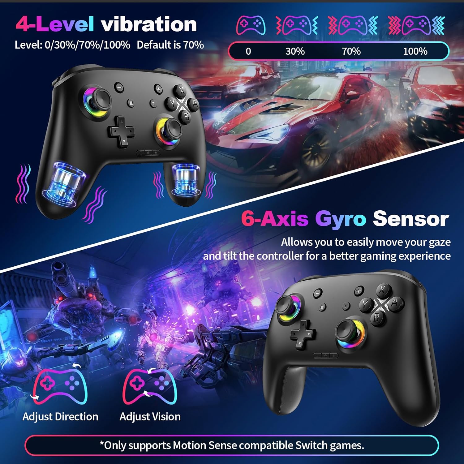 ⚡Vibrate Funtion & Gyro Sensor:This gaming controller options built-in twin vibration motors with low, medium, and excessive depth settings, delivering refined and exact haptic suggestions. Geared up with a 6-axis gyroscope sensor, it precisely captures tilt angles and responds swiftly, offering extremely delicate and practical movement management for interactive gaming experiences and larger immersive enjoyable.