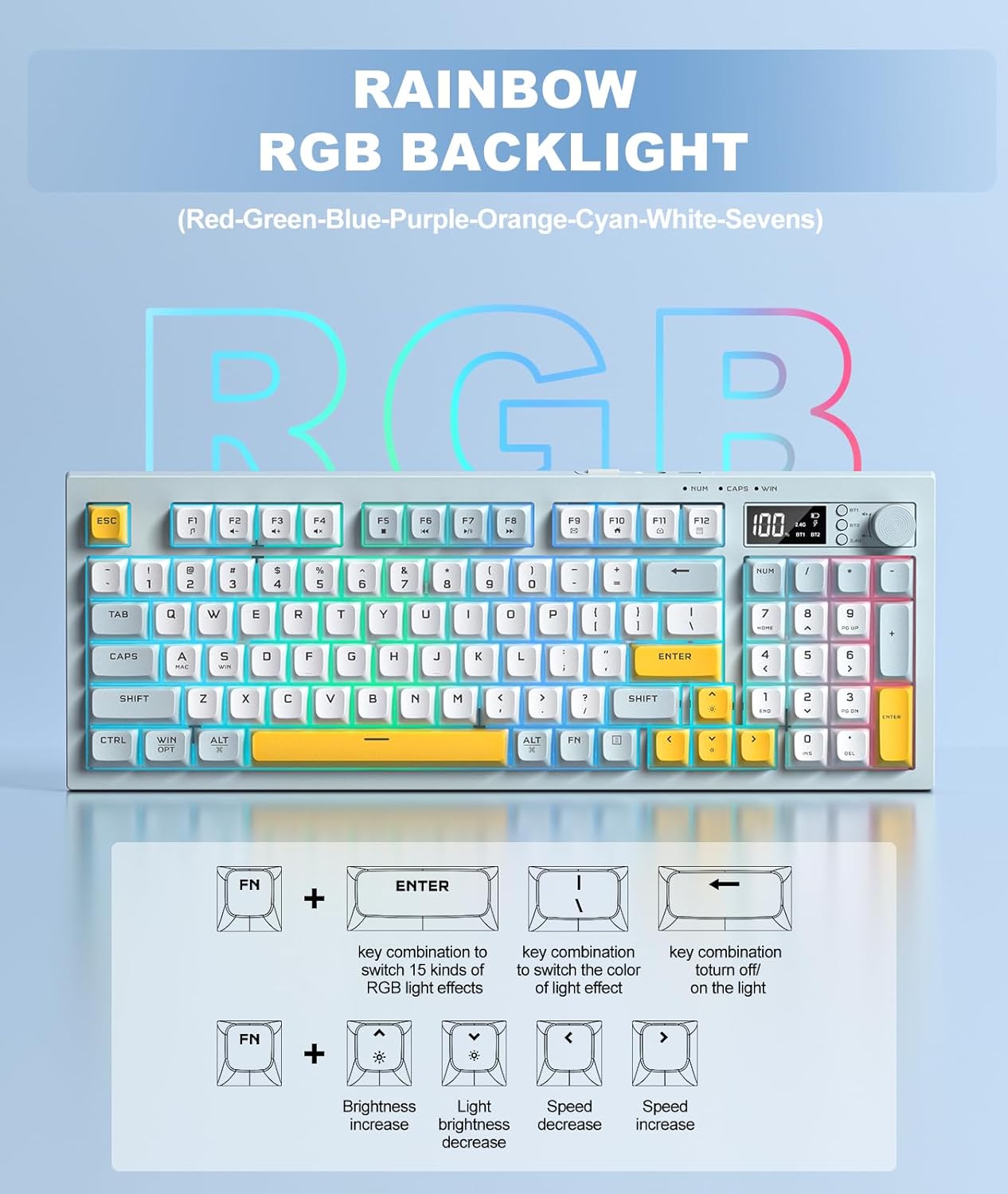 【Dynamic RGB Illumination】Create your ultimate ambiance with absolutely customizable rainbow backlighting. A number of lighting modes and brightness ranges allow you to personalize this wi-fi keyboard to match your setup or temper.