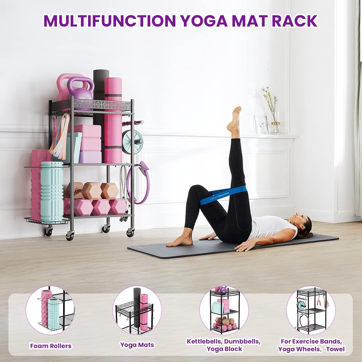 MUTI-PURPOSE STORAGE RACK: The exercise equipment storage is ideal for storing your workout equipment at home gym, yoga studios, garage. Such as yoga mats, foam rollers, yoga blocks, yoga wheels, dumbbells, kettlebells, resistance bands