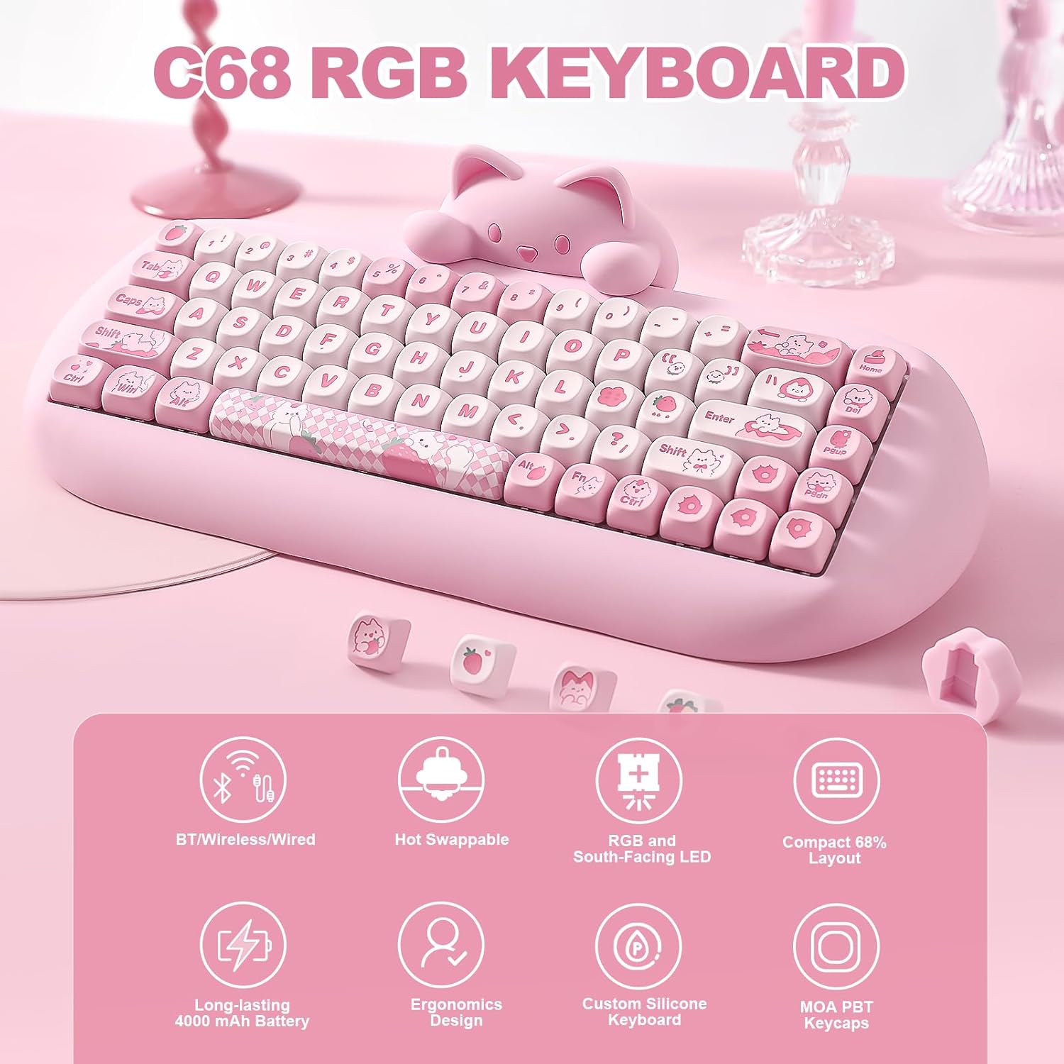 65% Structure, Cute Cat-Impressed Design: YUNZII C68 wi-fi mechanical keyboard is a novel cute keyboard with YUNZII revolutionary kawaii cat design crafted from premium silicone materials.The cat head of the keyboard is removable.You’ll be able to substitute different head in future.The 65% format 68 keys mechanical keyboard is compact and useful.This cute keyboard is appropriate for dwelling,workplace,workspace,outside,and informal video games